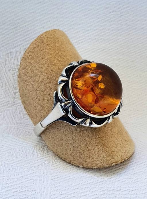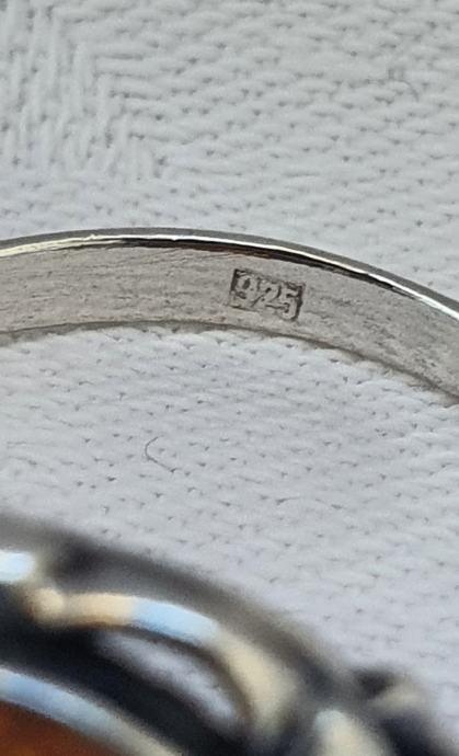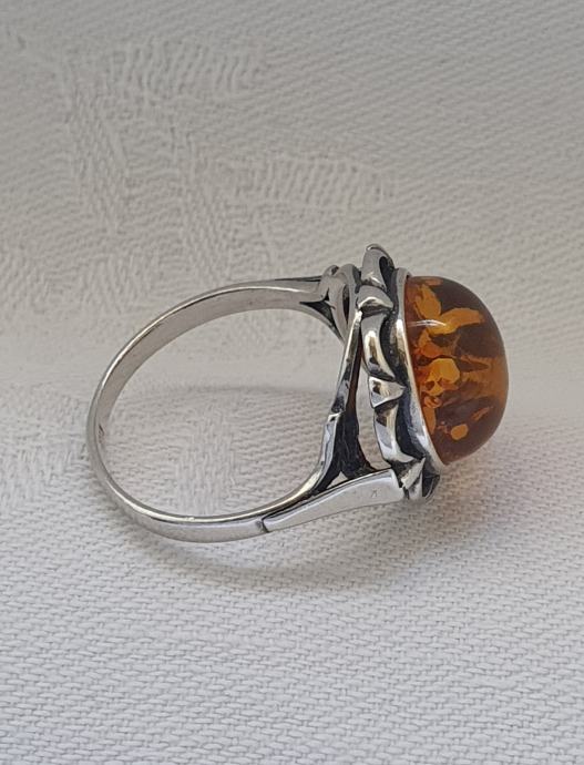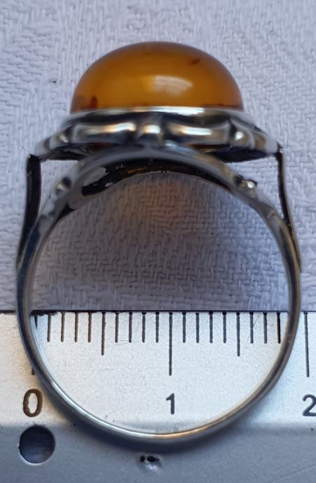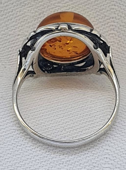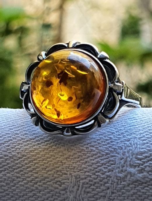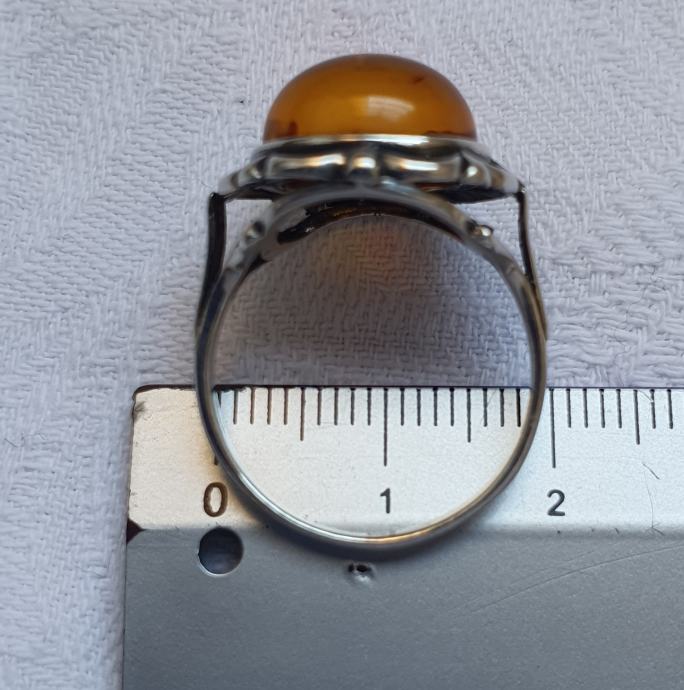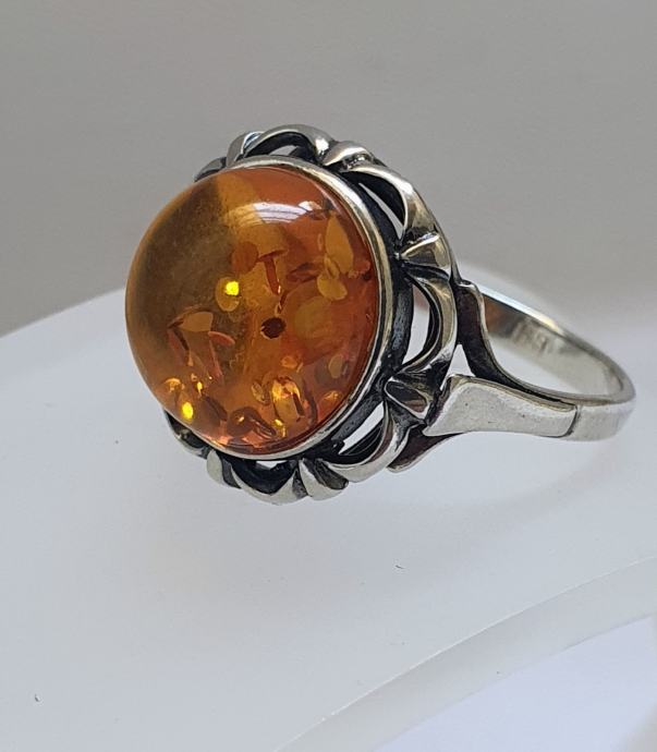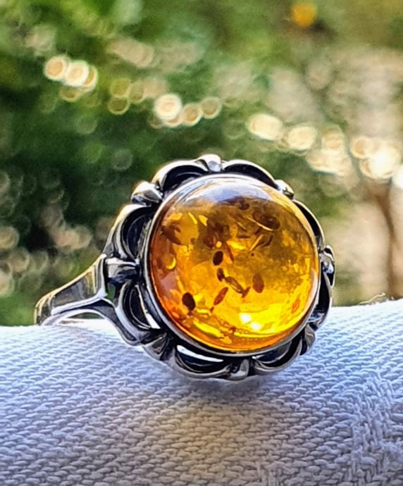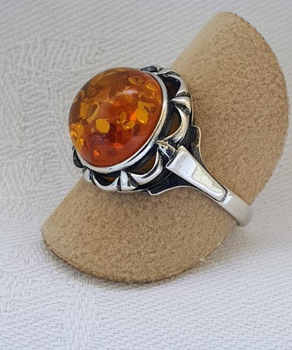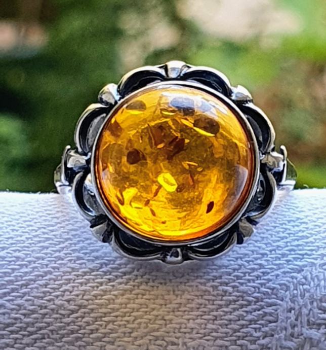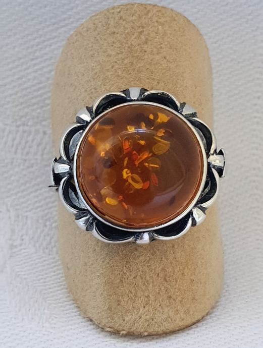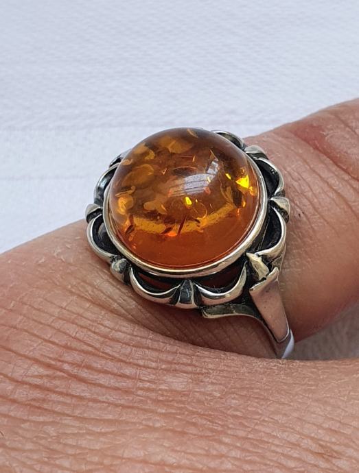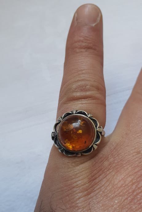 Predivan vintage stilski srebrni prsten ukrasen krasnim prirodnim jantarom stanje perfektno bez tragova nosenja unutarni promjer 18 mm kugla vabocjon promjera 1,3cm ispupčenje ukupnon7mm