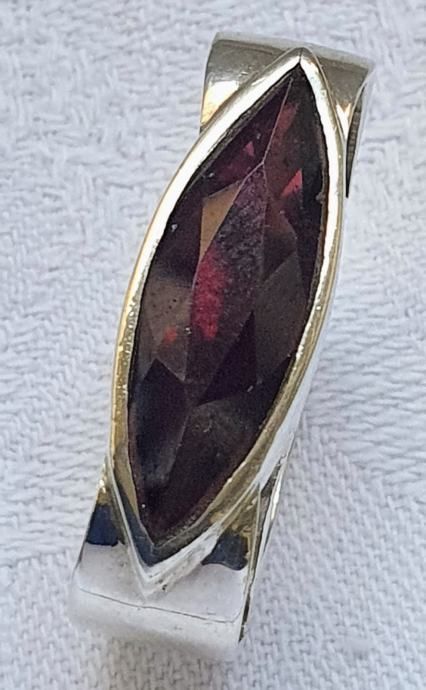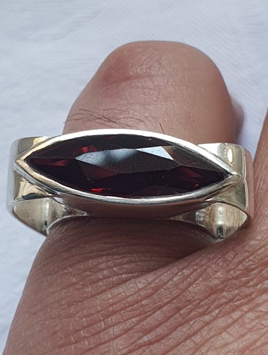 Veliki i masivni koktel prsten modernisticki dizajn ukrasen velikim brusenim tamno crvenim prirodnim granatom boje crnog vina ,na visem svijetlu se vise istiće boja