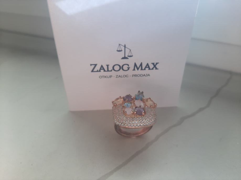 Prsten je atraktivnog, modernog dizajna sa ukrasnim kamenima.