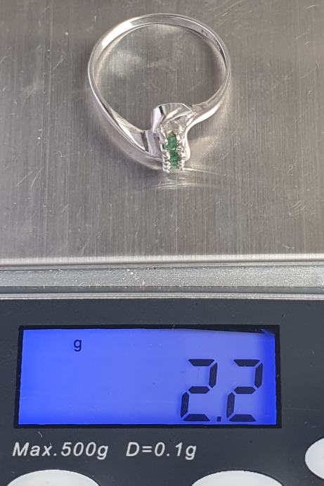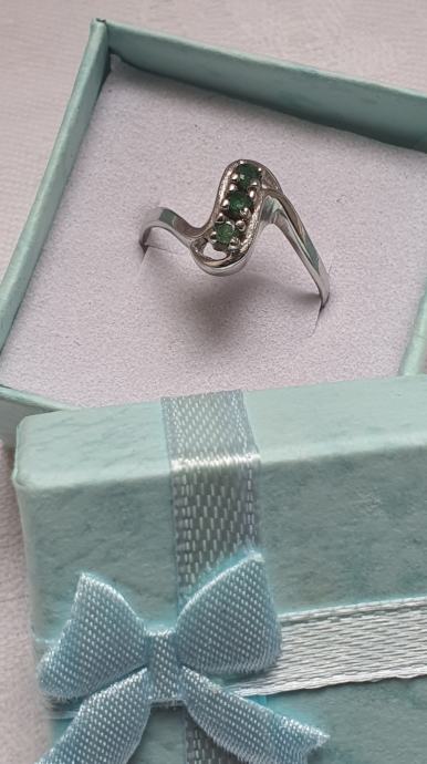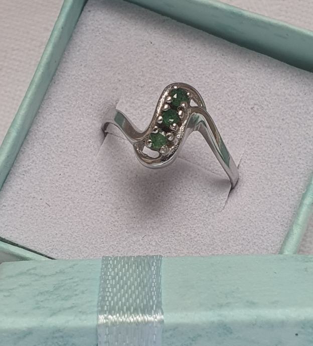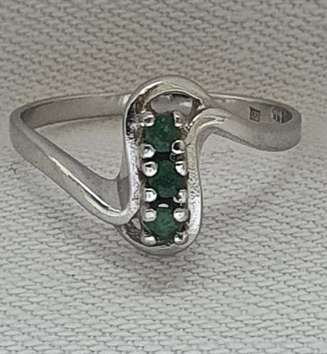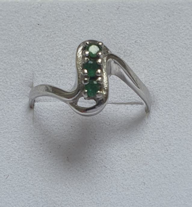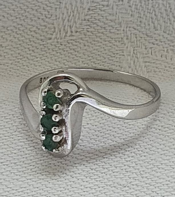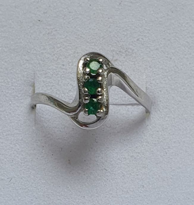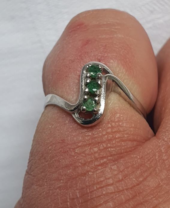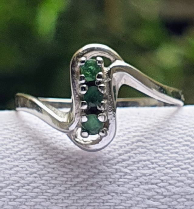 Krasan srebrni prsten ukrasen sa tri brusena prirodna smaragda promjera 2 mm srebro 800 plus potpos majstora unutarnji promjer pratena je 17mm