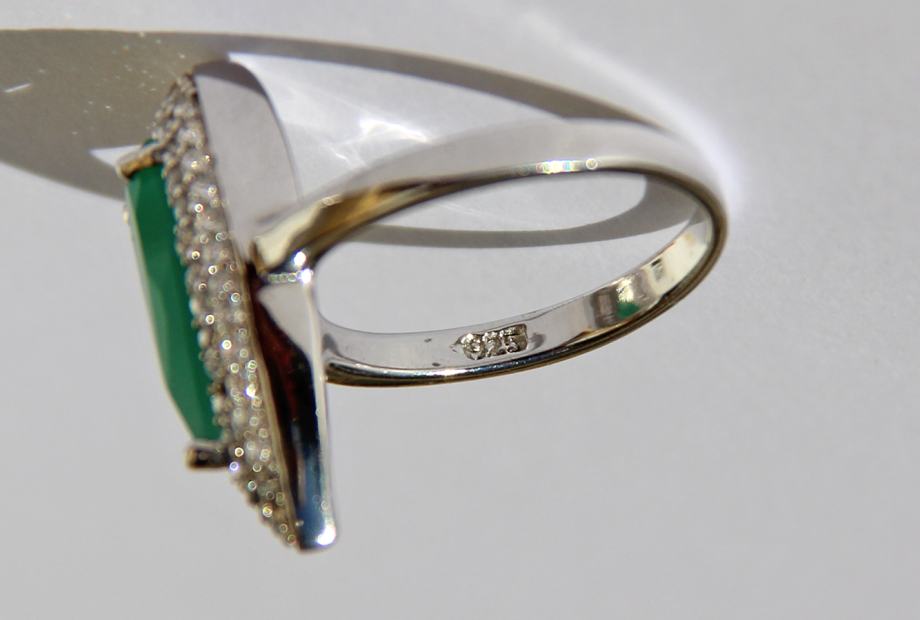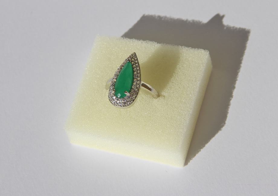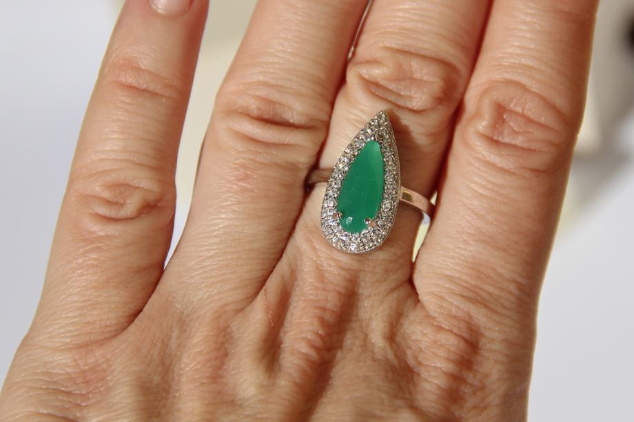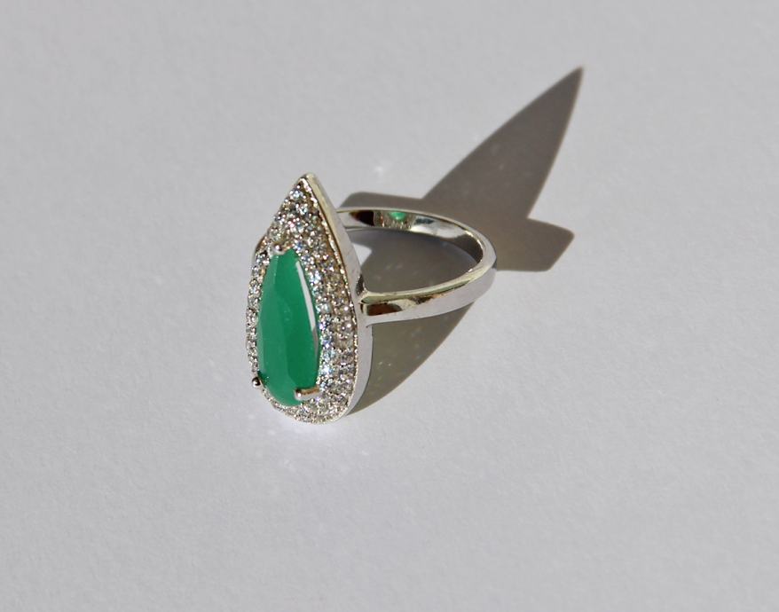 Prsten je načinjen od poludragog kamena zelenog aventurina okruženog cirkonima.