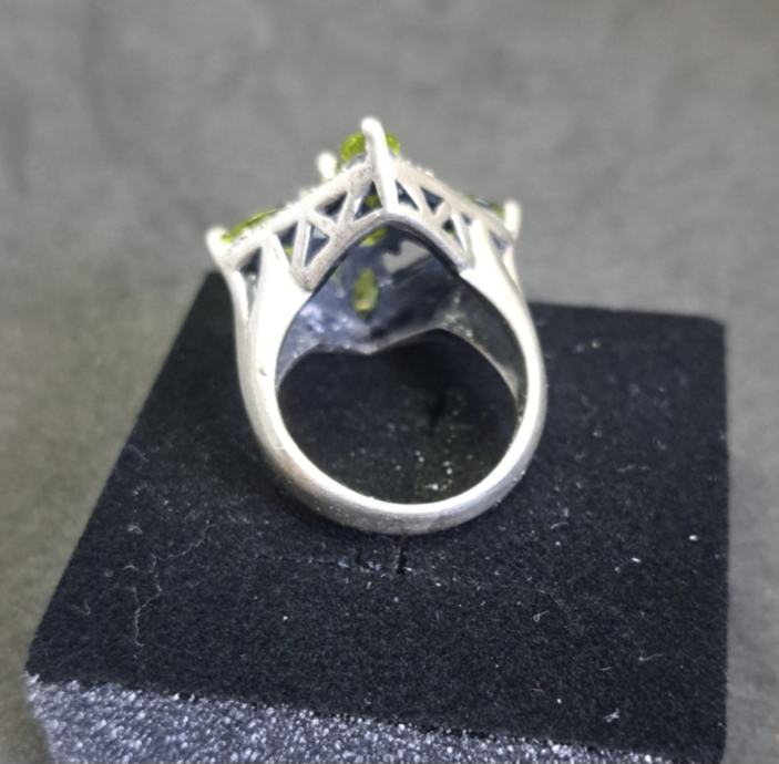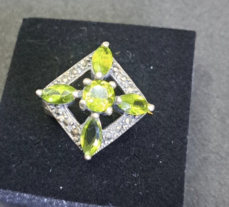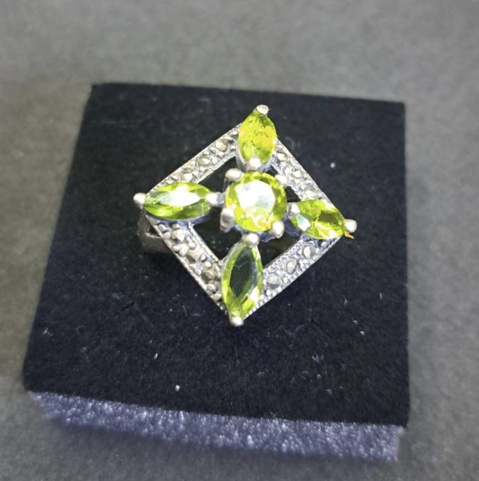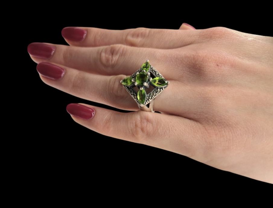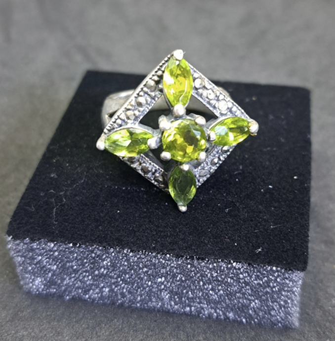 Art Deco srebrni prsten rađen od 925 srebra te 5 prirodnih peridota svezajedno 4 kt.