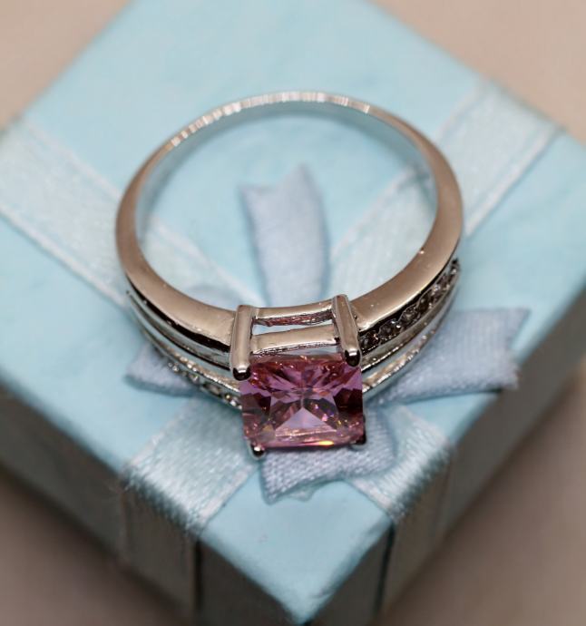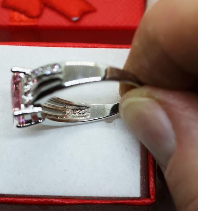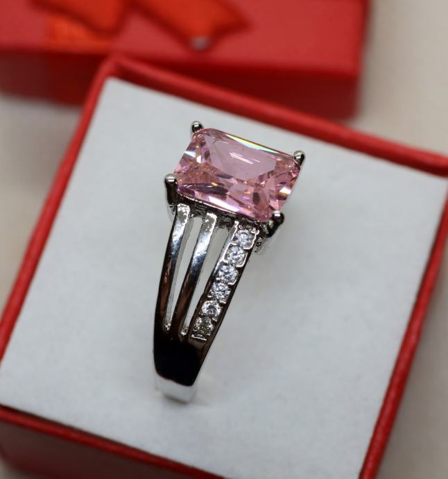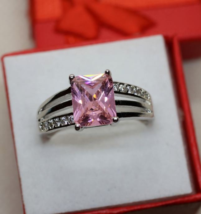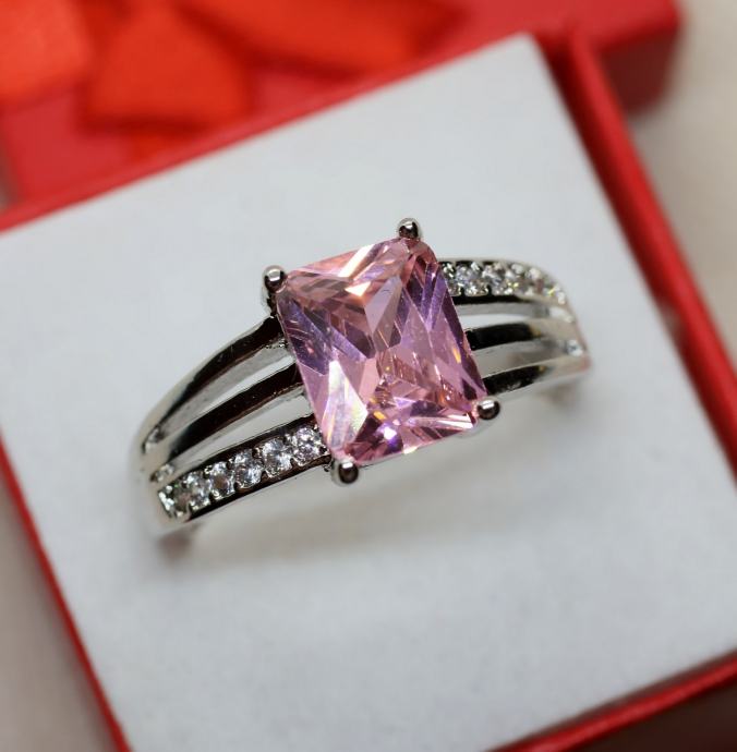 prekrasan moderan i romantičan novi srebrni prsten sa glavnim kamenom ružičasti topaz veličine 8mm*6mm; i sa svake strane po 6 malih bijelih kamena bijelog topaza (lab.kreirani kubični cirkoni). za prst veličine 20,6 mm. nenošeno.