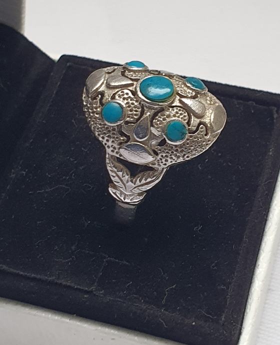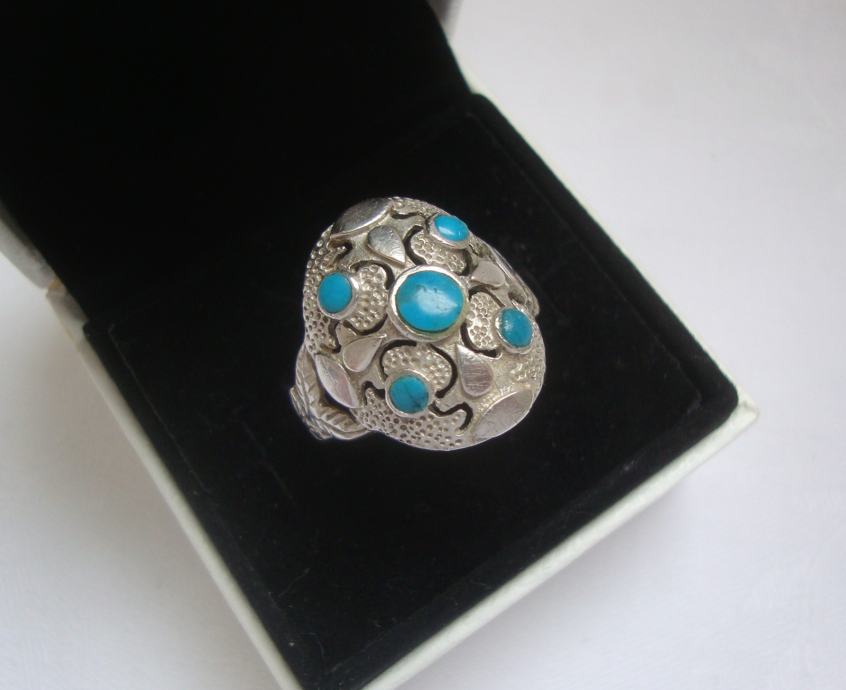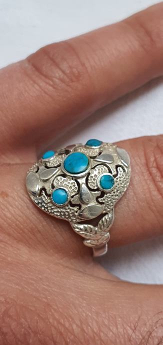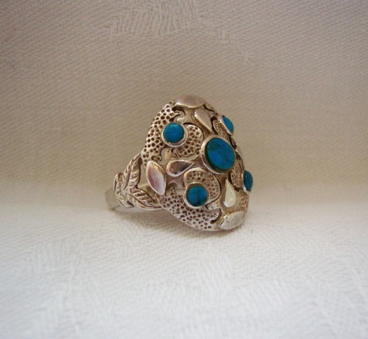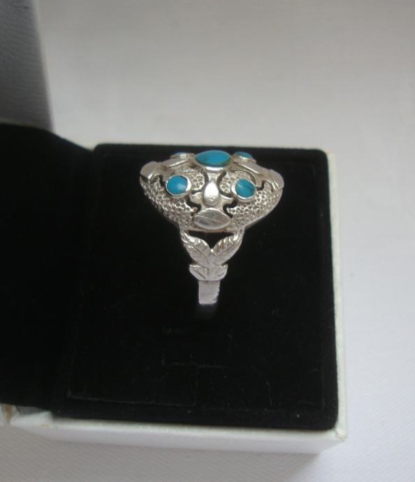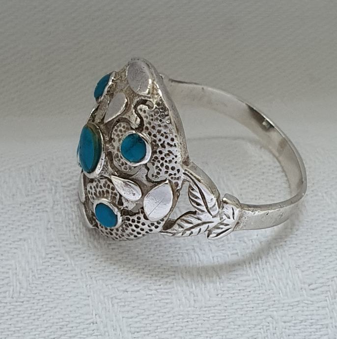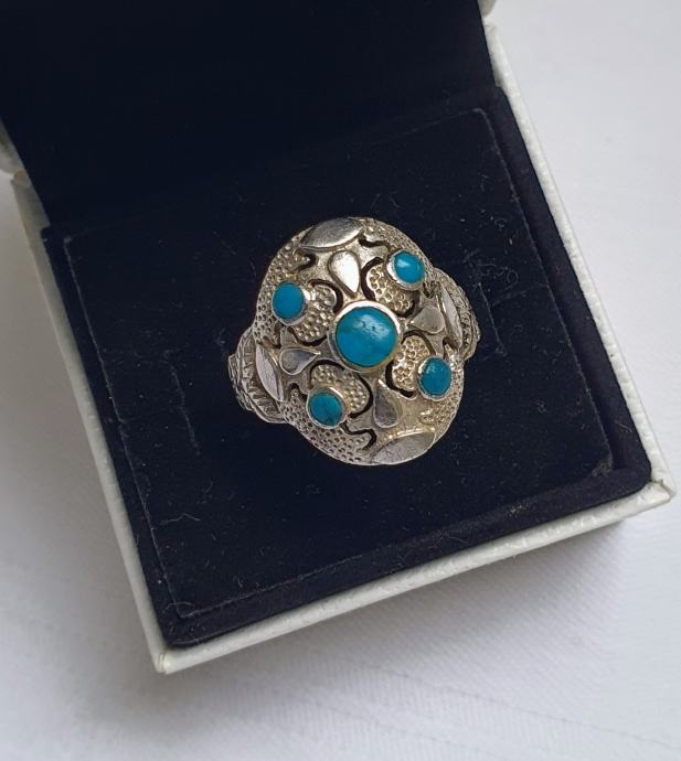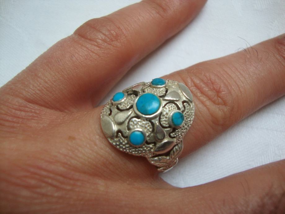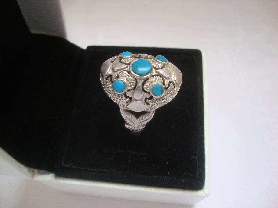 Predivan veliki raskošni srebrni prsten ukrašen tirkiz kamenjem
