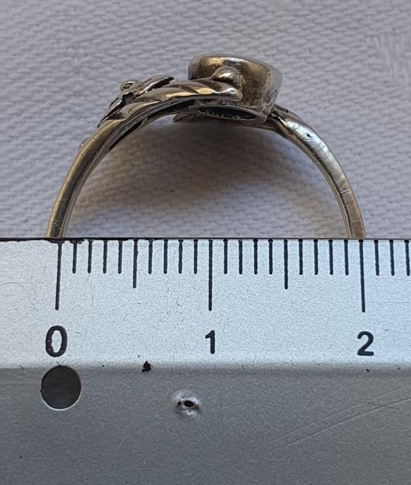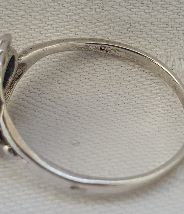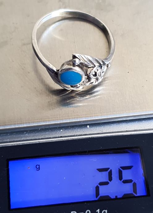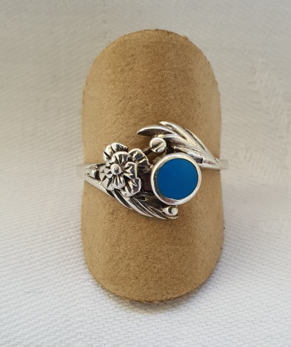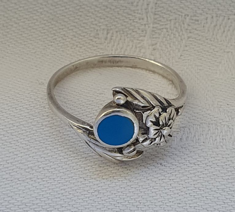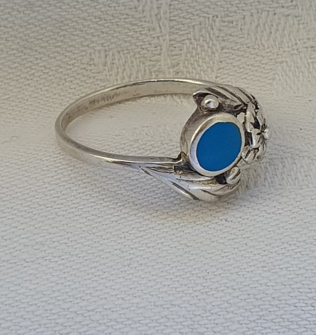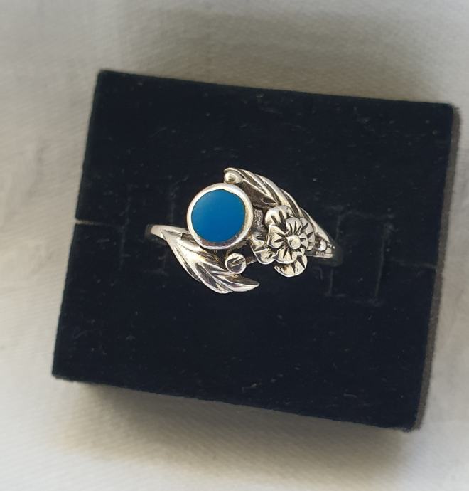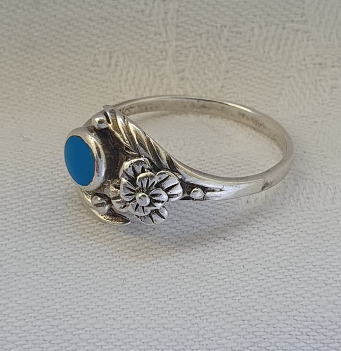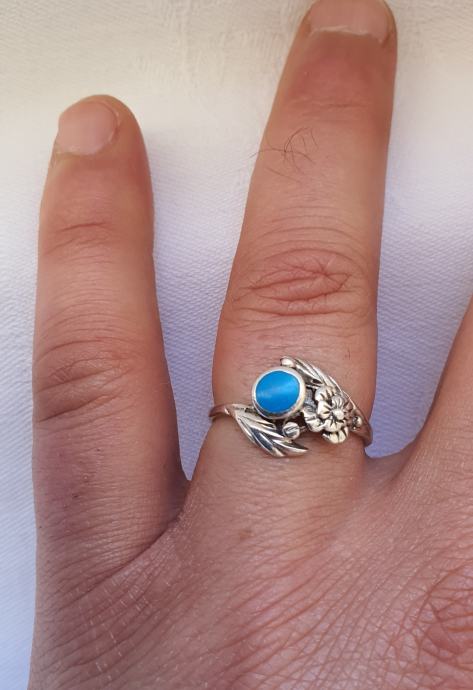 Krasan srebrni prsten sa tirkiz kamenom ukrašen cvijetićem ručni rad unutarnji promjer 19,5 mm skoro 2 cm