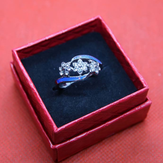 Prsten posrebren sa žigom 925 srebra, sa tri bijela cvjetića i plavim opalom
