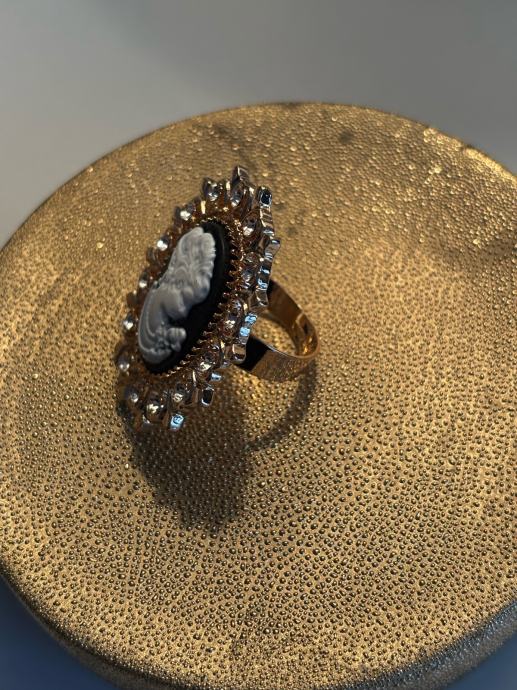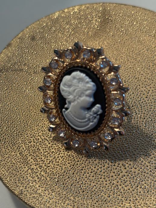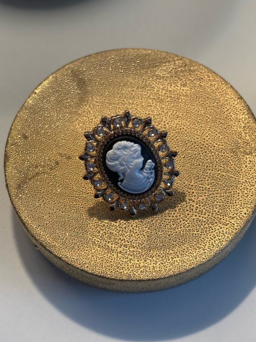Prodajem prekrasan vintage prsten s kamejom u stilu antike. Prsten ima ovalnu kamеju s motivom ženskе glave u profilu na tamnoj podlozi, okruženu ukrašenim okvirom sa svjetlucavim kamencima. Boja okvira je toplija brončana nijansa koja lijepo naglašava središnji motiv. Prsten je od bižuterije, elegantan i dekorativan komad koji daje dašak starinske sofisticiranosti.