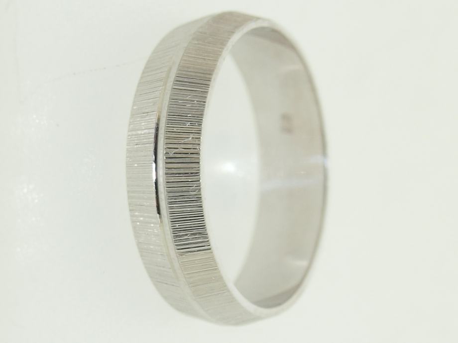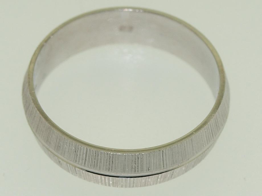 Vjenčani prsten, bijelo 14K zlato, štambilj 585, flah (ravno) iznutra, izvana u špic, glat uzdužni kanal + reckice.