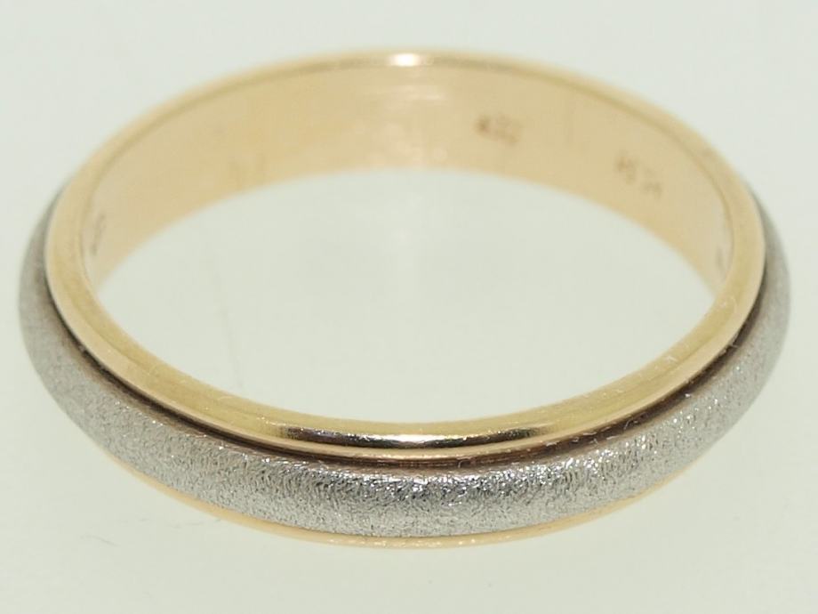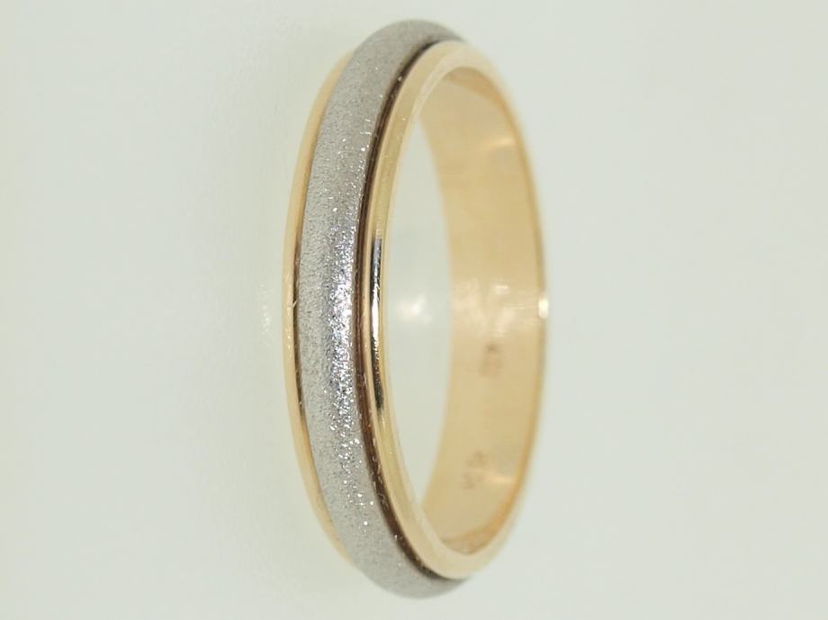 Vjenčani prsten, kombinacija žuto-bijelo 14K zlato, štambilj 585, bombe (oblo) bijelo mat "navučeno"/zalotano na žuto, iznutra flah (ravno).