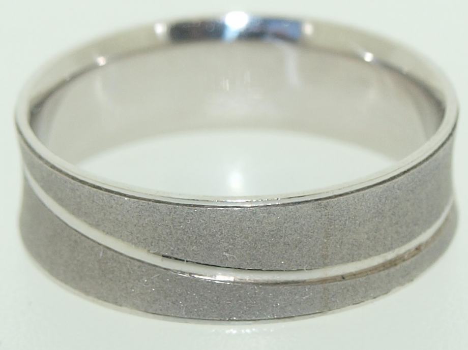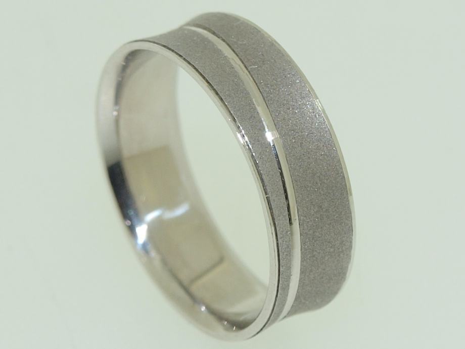 Vjenčani prsten, bijelo 14K zlato, iznutra bombe (oblo), izvana obrnuti bombe, izvana mat + glat valovita linija.