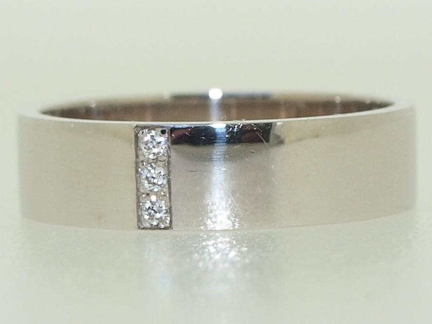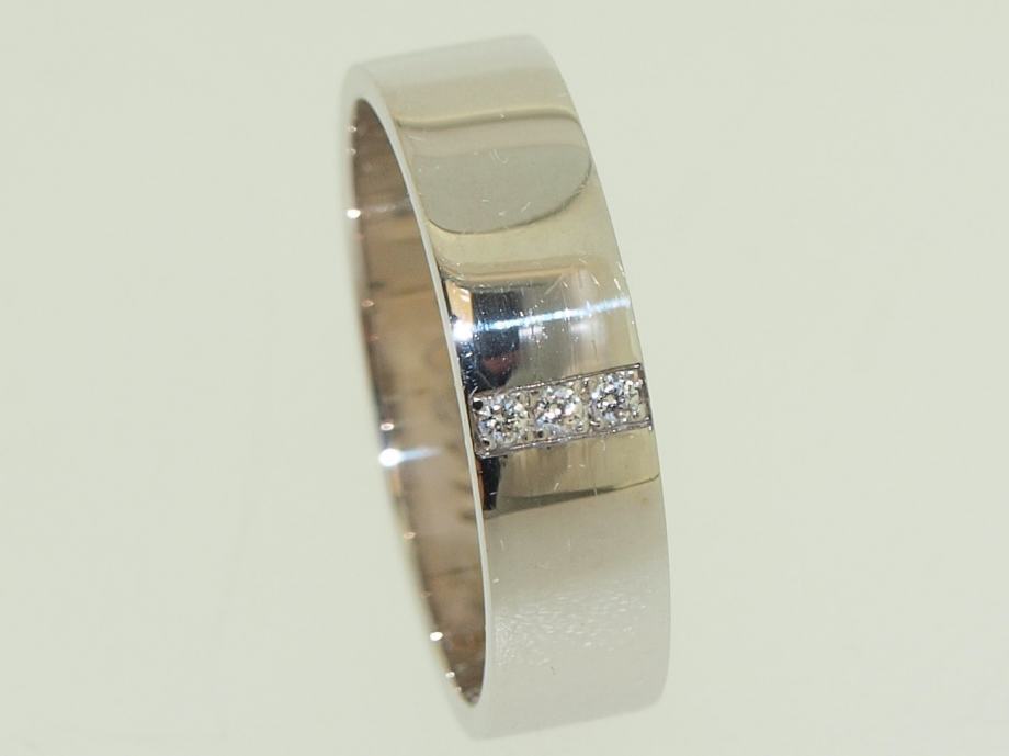 Vjenčani prsten, bijelo 14K zlato, štambilj 585, flah (ravno) iznutra i izvana, glat, 3 bijela cirkona fasana na "korne".