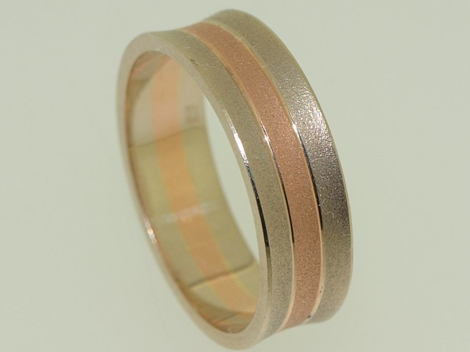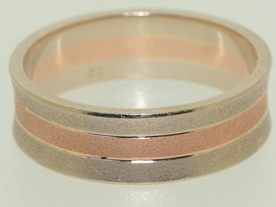 Vjenčani prsten, kombinacija bijelo-crveno 14K zlato, štambilj 585, flah (ravno) iznutra, izvana obrnuti bombe (oblo), bijelo 2 mm + crveno 2 mm + bijelo 2 mm.