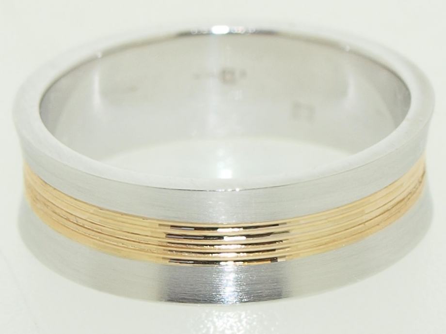 Vjenčani prsten, kombinacija žuto-bijelo 14K zlato, štambilj 585, flah (ravno) iznutra, izvana obrnuti bombe (oblo prema unutra), bijelo 2 mm + žuto 2 mm + bijelo 2 mm.