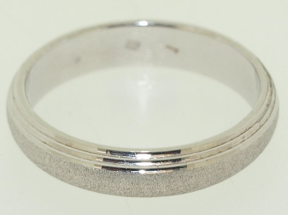 Vjenčani prsten, bijelo 14K zlato, štambilj 585, flah (ravno) iznutra, izvana bombe (oblo), izvana mat + linije navoji.