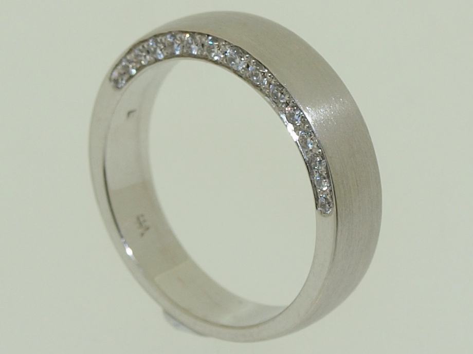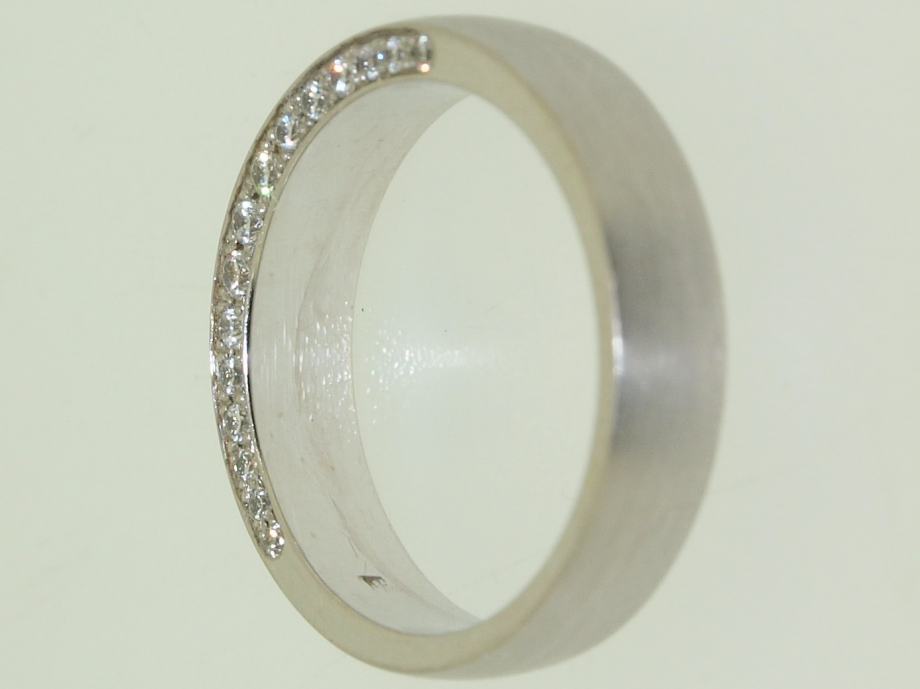 Vjenčani prsten, bijelo 14K zlato, štambilj 585, flah (ravno) iznutra, izvana lagani bombe (oblo), izvana lagani mat, bočno u prsten s obje strane ufasani bijeli cirkoni na "korne" - 2 x 15 komada.