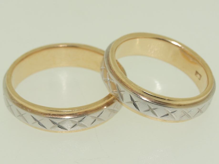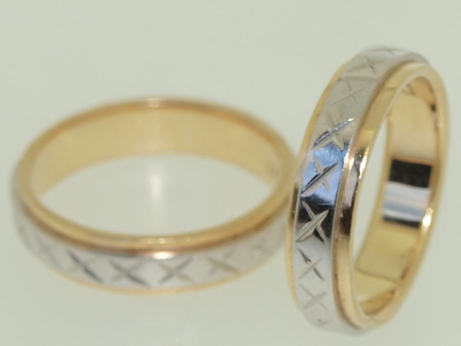 Vjenčano prstenje - par, kombinacija žuto-bijelo 14K zlato, štambilj 585, flah (ravno) iznutra i izvana, izvana bijelo "navučeno" zalotano na žuto.