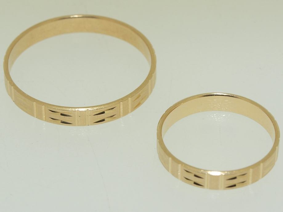 Vjenčano prstenje - par, žuto 14K zlato, flah (ravno) iznutra i izvana, izvana reckice + crtice.