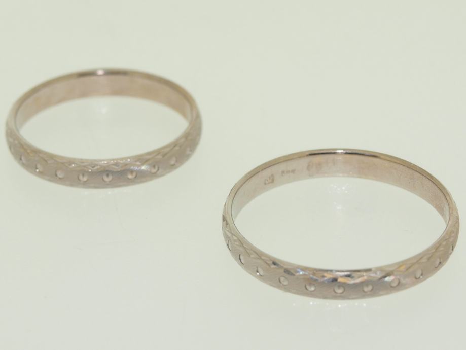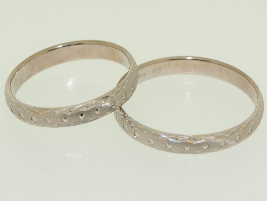 Vjenčano prstenje - par, bijelo 14K zlato, flah (ravno) iznutra, izvana bombe, mat/reckice/točkice.