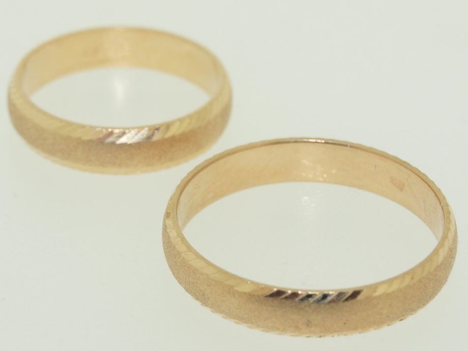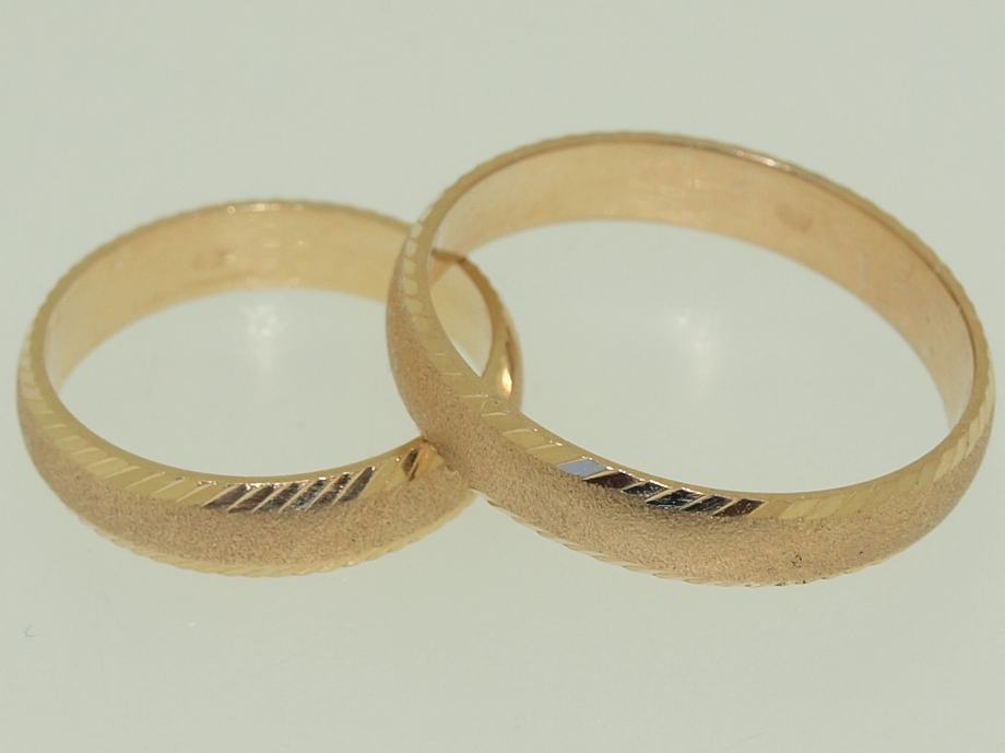 Vjenčano prstenje - par, žuto 14K zlato, žig 585, flah (ravno) iznutra, izvana bombe (oblo), izvana mat, rubovi nareckani.
