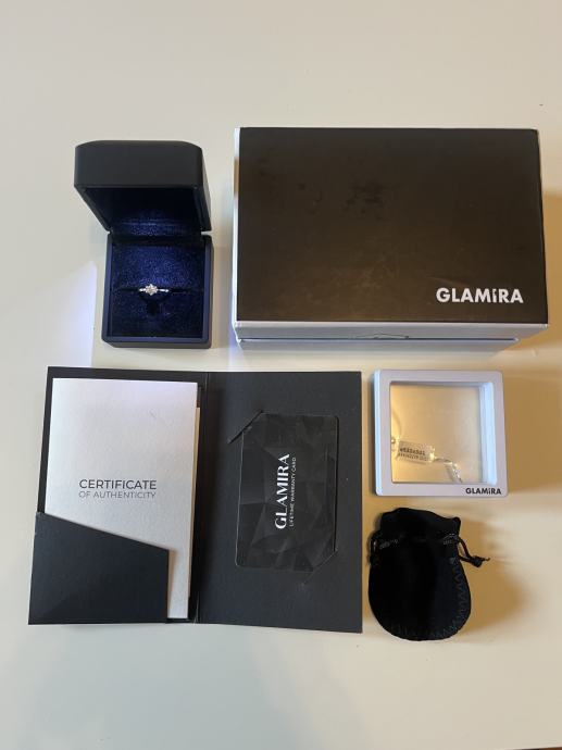 Nov i nekorišten 0,5 karatni dijamantni zaručnički prsten Breath od 14 karatnog bijelog zlata kupljen kod Glamire. Posjeduje račun, certifikat, kutije i svu ostalu dokumentaciju. Trenutna cijena prstena je 2125 €