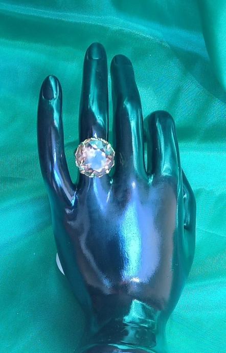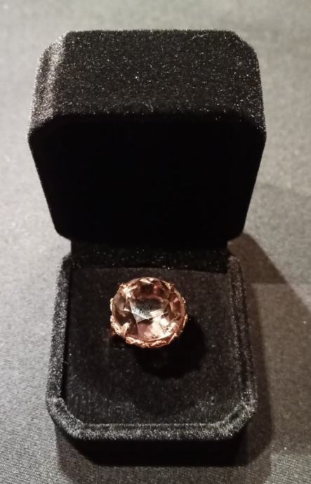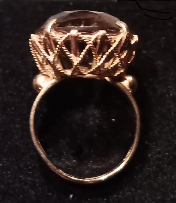 U prsten je centralno ugrađen i učvršćen uz pomoć četiri (4) držača tzv. krapa 1 tamnosmeđi kamen, okruglog oblika i facetiran. Kamen je anizotropičan (bull’s eye) i ima indeks loma 1.540-1.550, radi se o prirodnom Kremenu-Čađavcu.