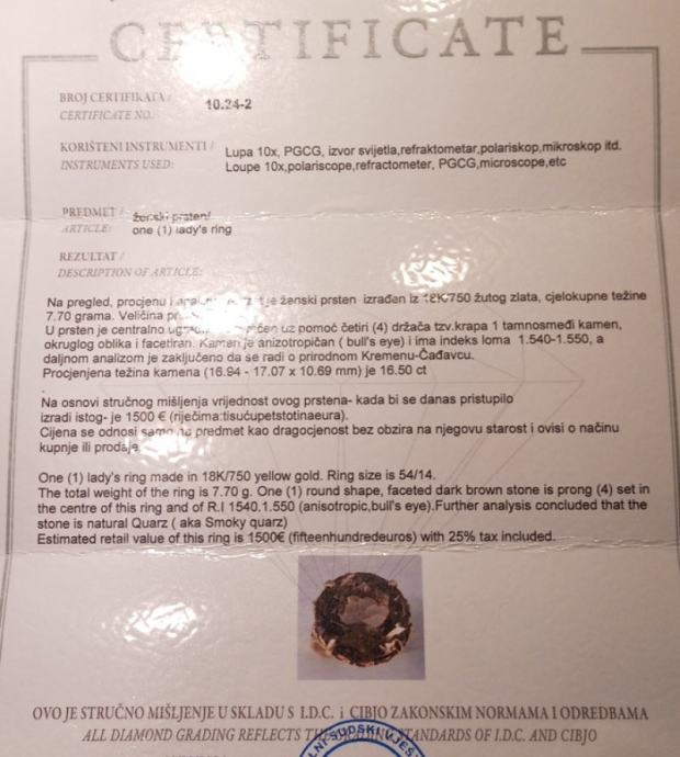 Certifikat izdan od strane diplomiranog gemologa F.G.G. i procjenitelja dijamanata te stalnog sudskog vještaka za zlatarstvo i draguljarstvo u Zagrebu.