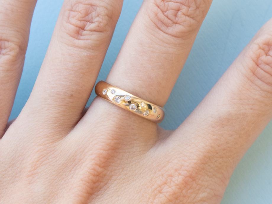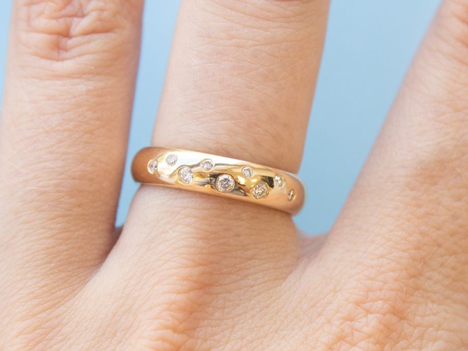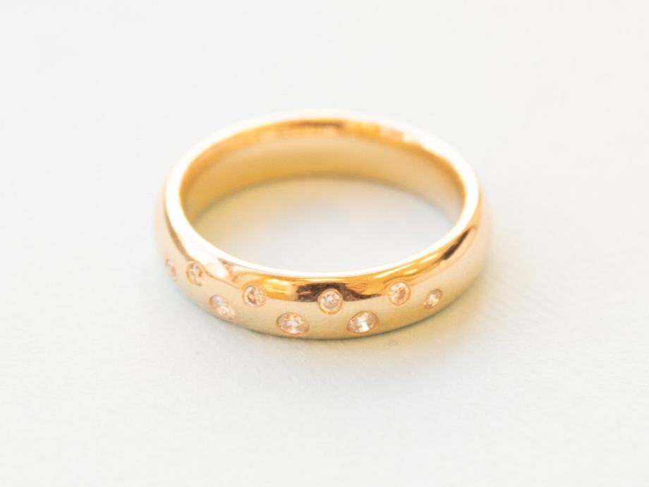 Zlatni dijamantni prsten, žuto zlato, glat površina, 14K zlato, žig 585, 9 dijamanat glat ufasanao.