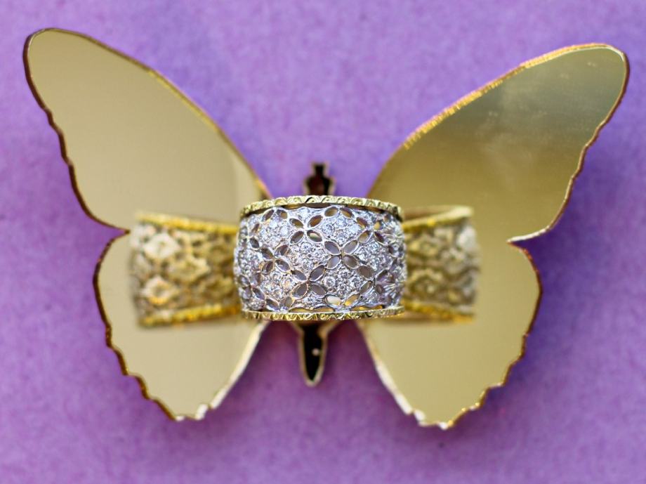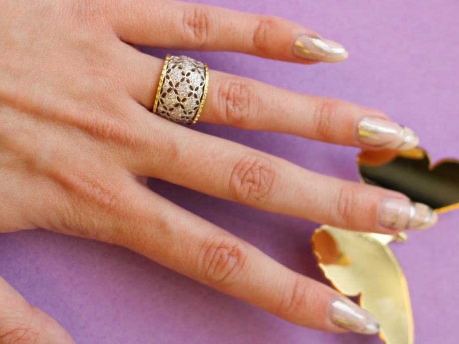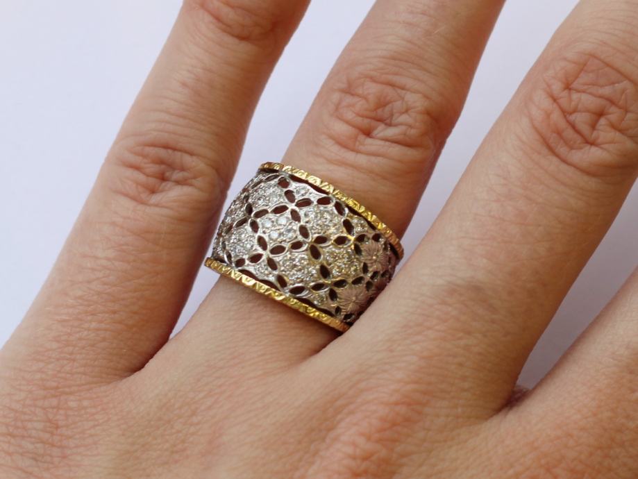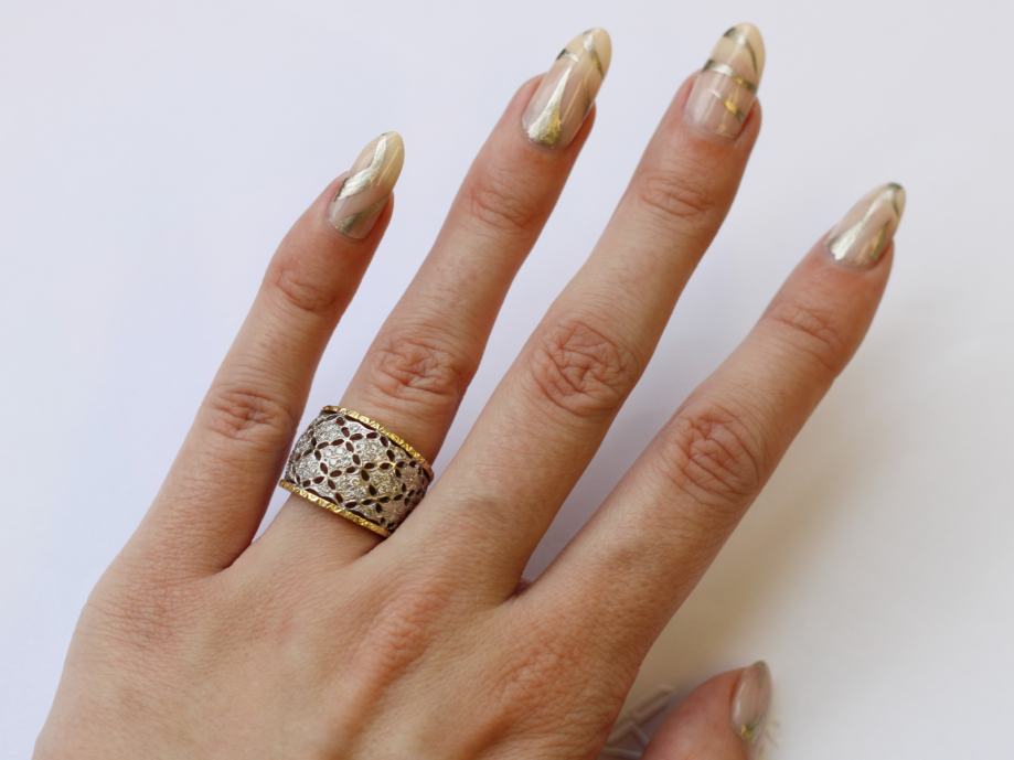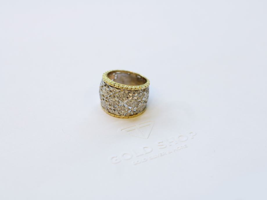 Zlatni prsten, ženski, kombinacija bijelog i žutog zlata, 18K, žig 750, filigranski rad - filigranski listići.