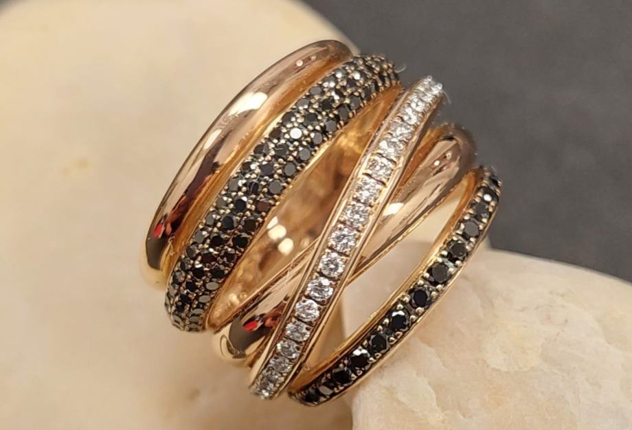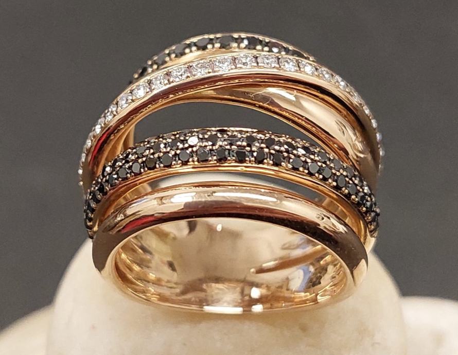 Zlatni prsten, ženski, crveno zlato 14K, žig 585, crni i bijeli dijamanti, 5 šina širine 10,15 do 17,30 mm.