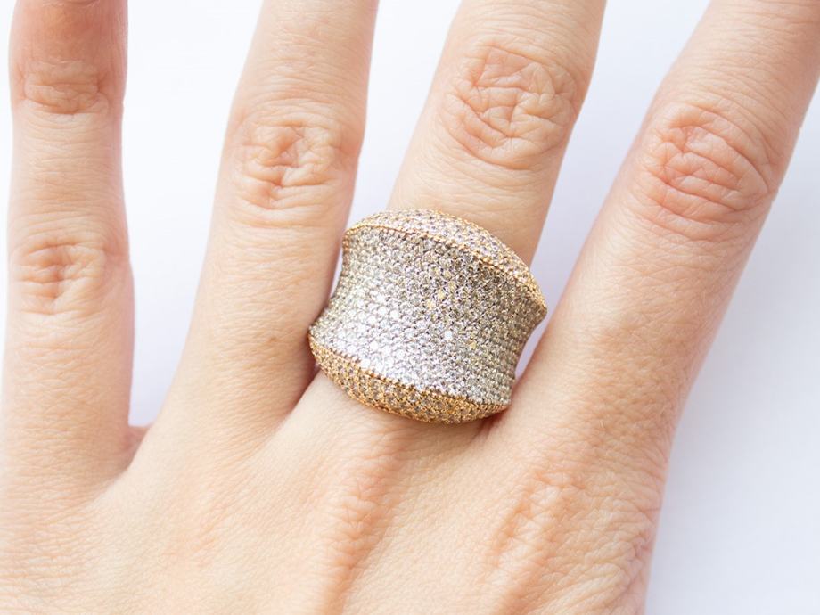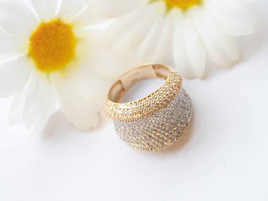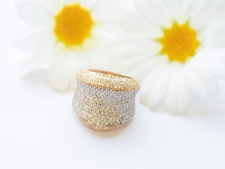 Zlatni široki prsten, ženski, žuto zlato 14K, žig 585, puno malih bijelih cirkončića.