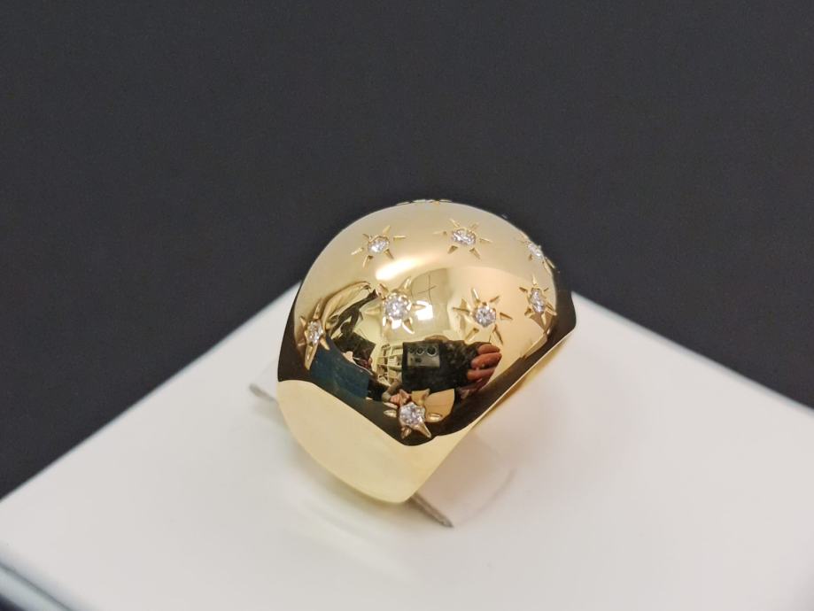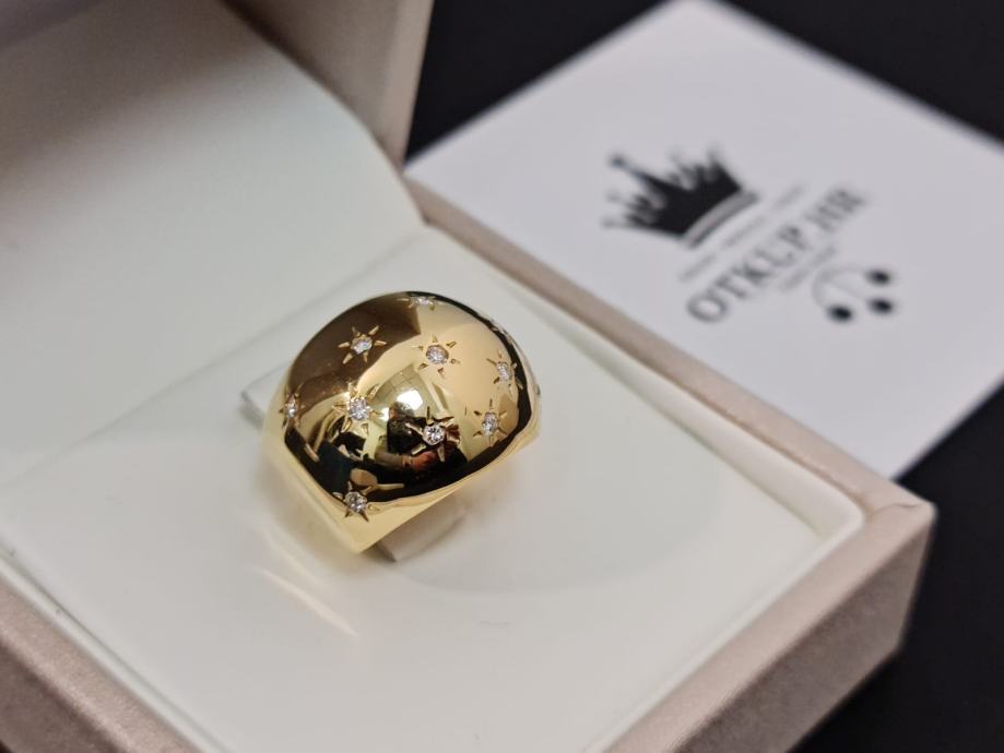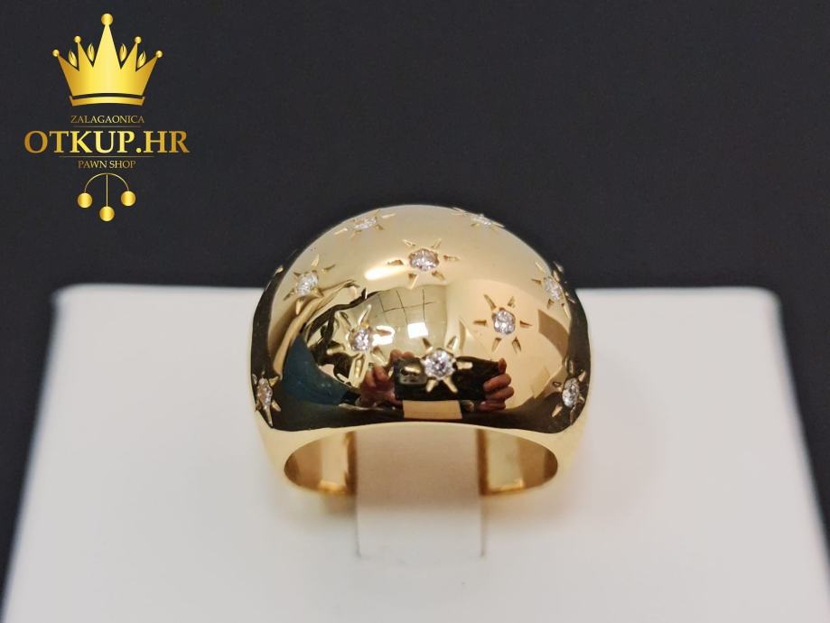 Prodajemo prsten od 18 karatnog žutog zlata ukrašen dijamantima.