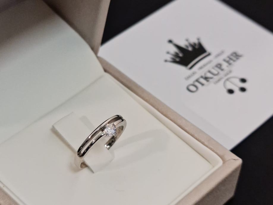 Prodajemo zlatni prsten od 14 karatnog bijelog zlata, ukrašen dijamantom.