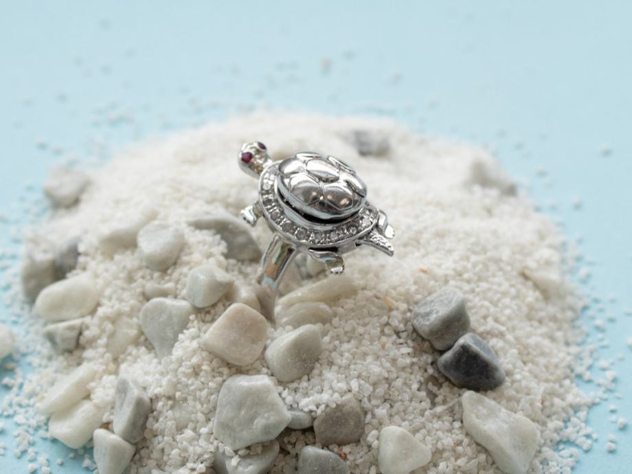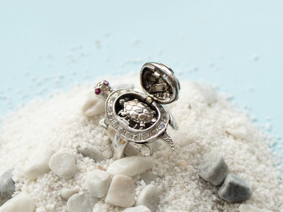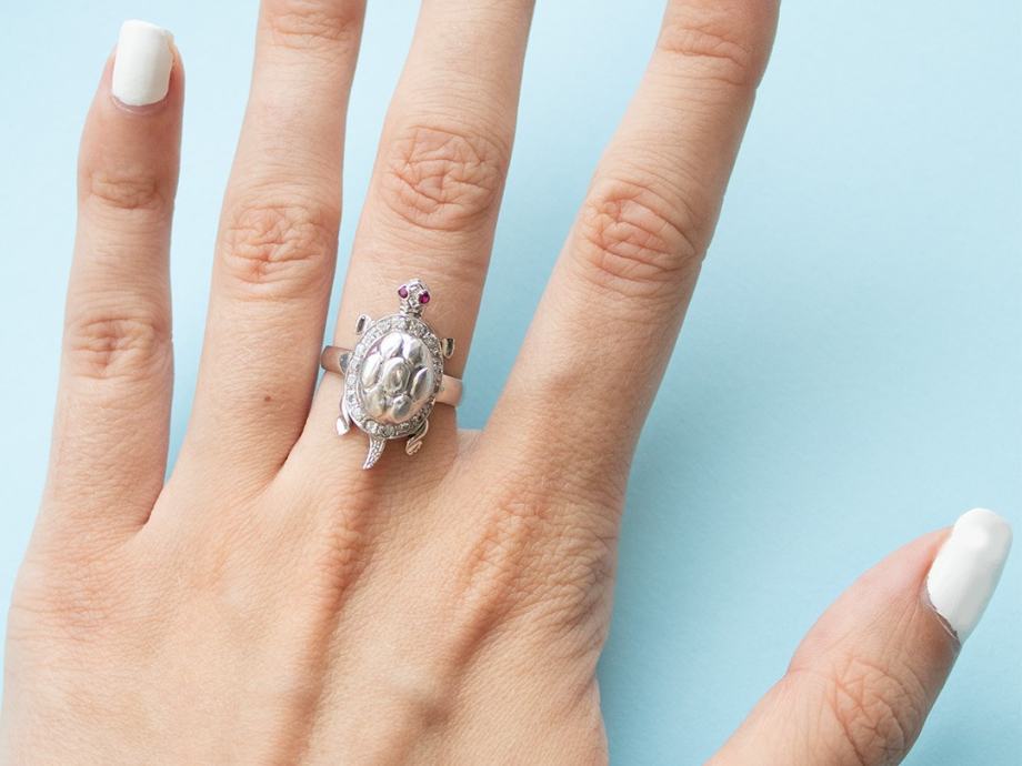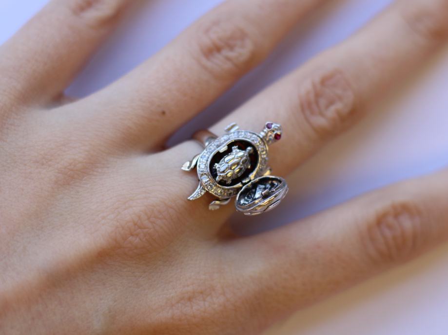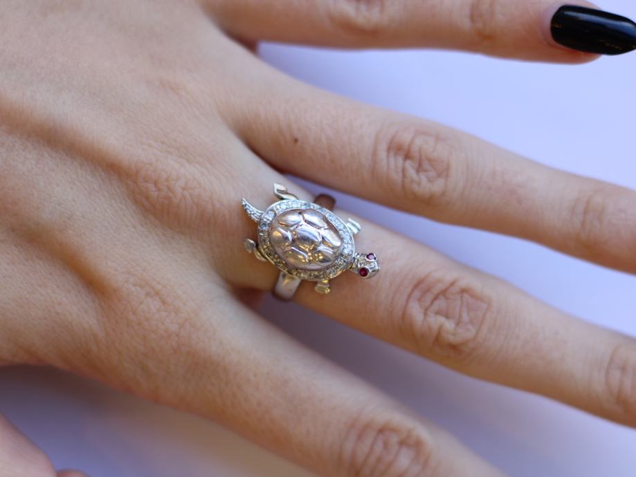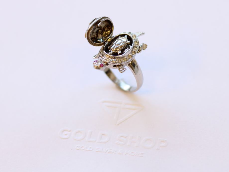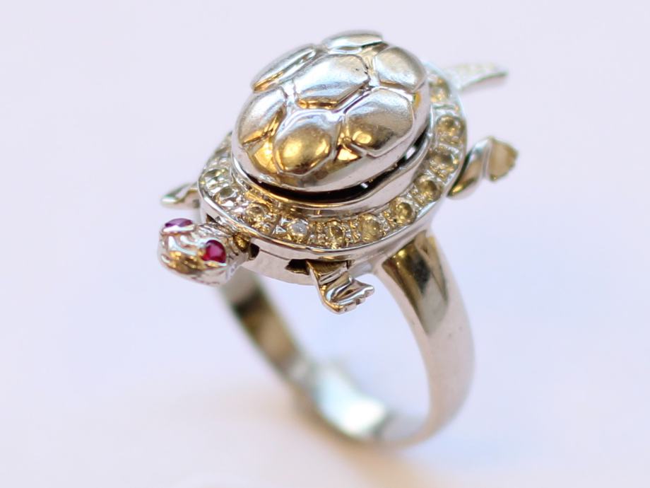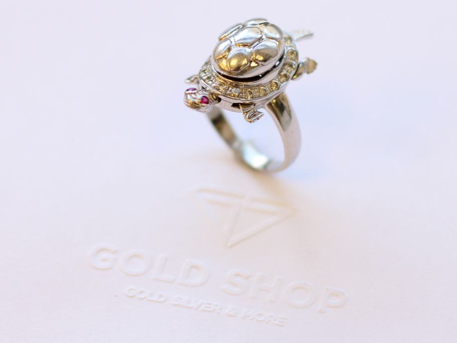 Zlatni prsten, ženski, bijelo zlato 14K, žig 585, unikat, kornjača, 2 crvena cirkona kao oči + bijeli cirkoni u krug, oklop se otvara prema gore, pomične nožice, glava i rep.