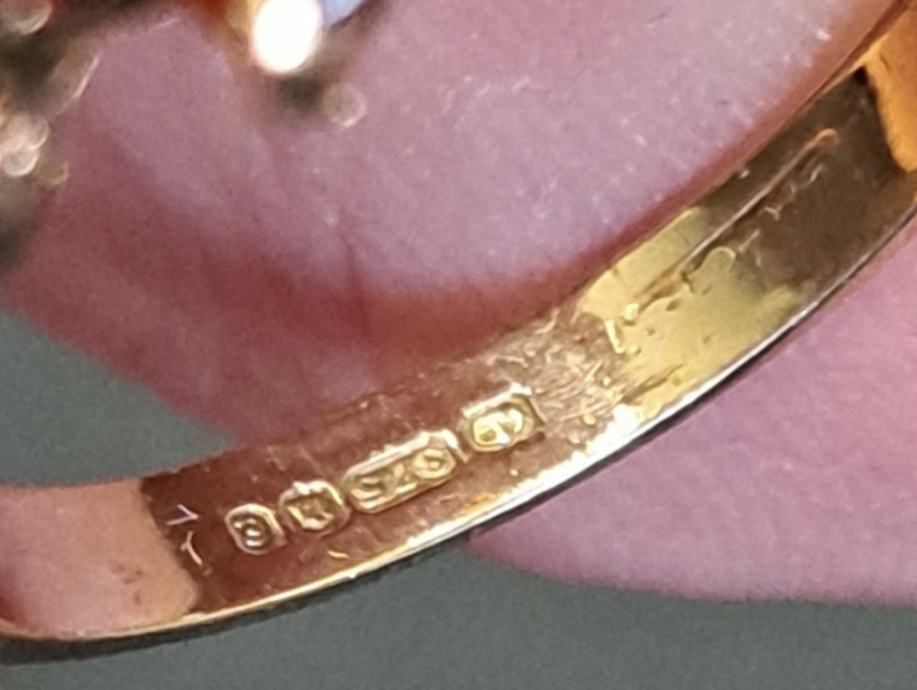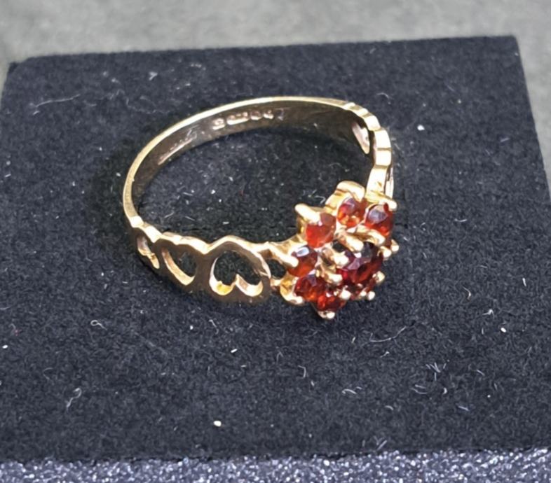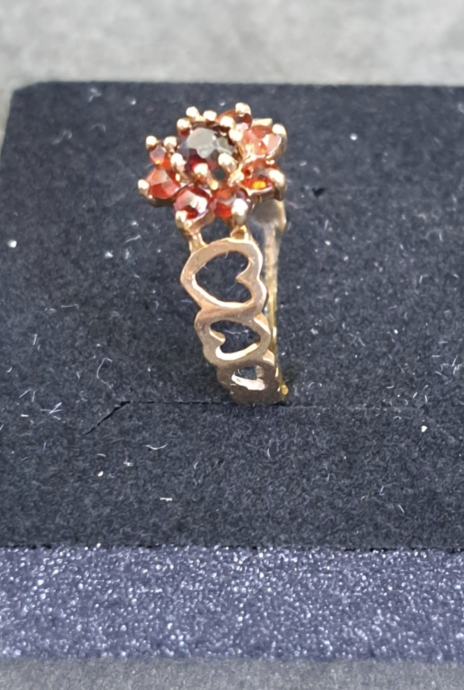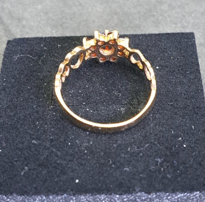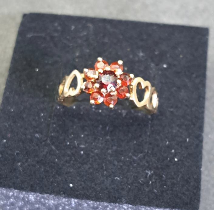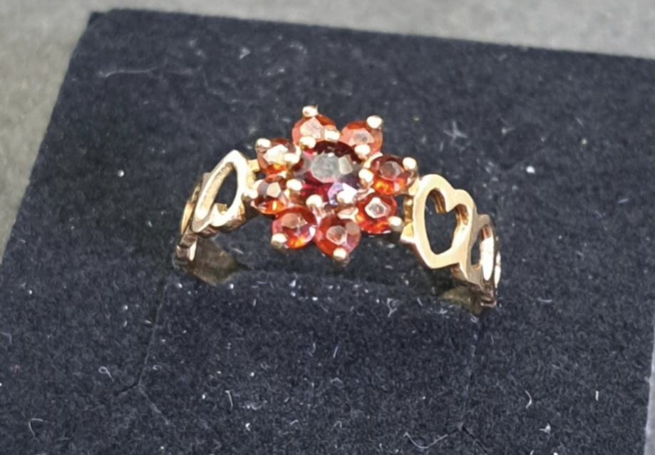 Zlatni prsten rađen od 9kt zlata te sadrži 1 veći crveni garnet u sredini od 0.30kt te 8 manjih crveni garneta 0.80kt.