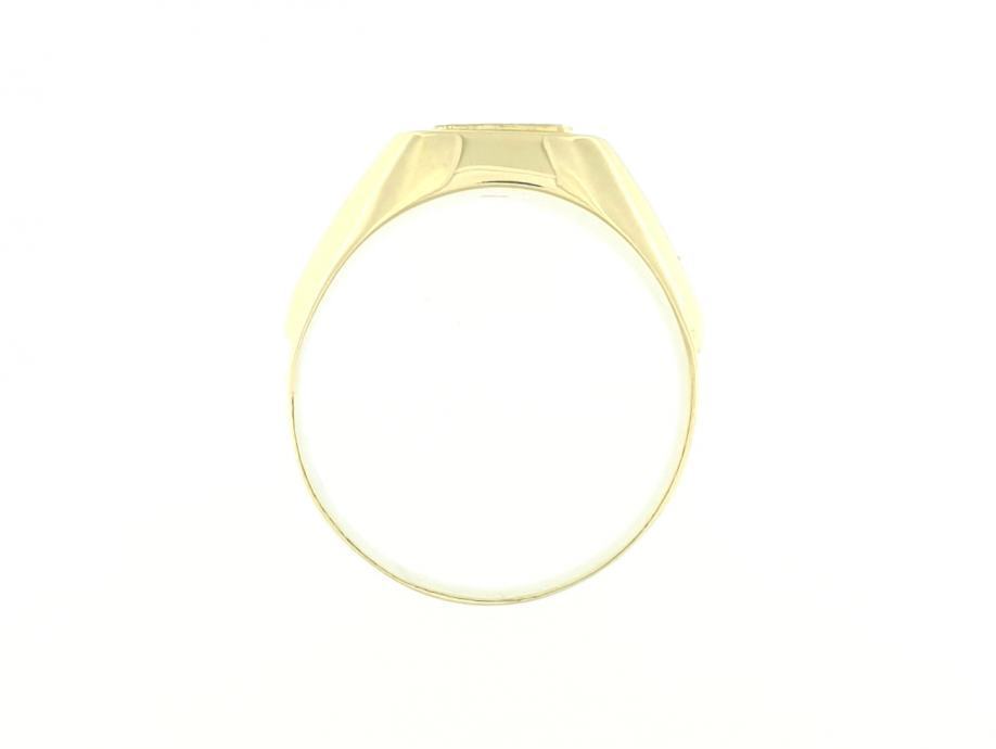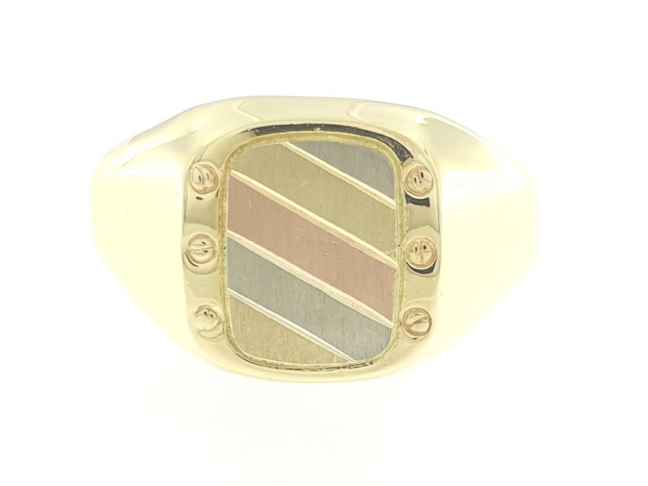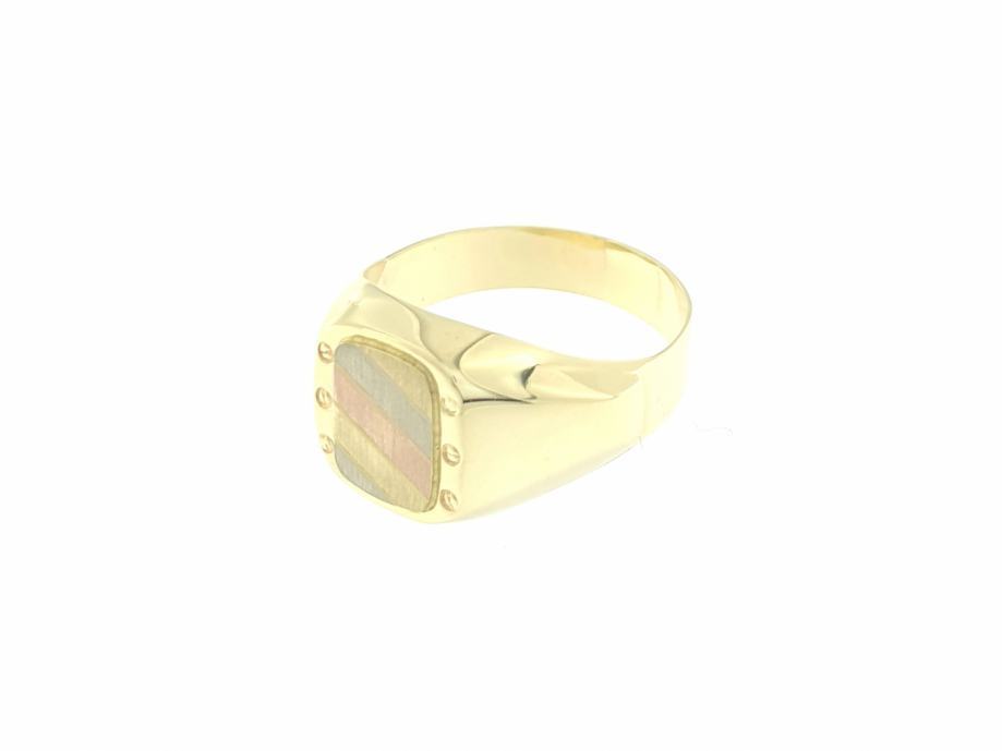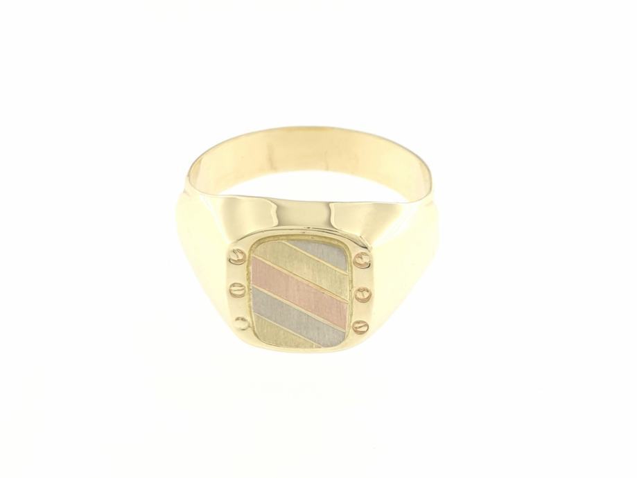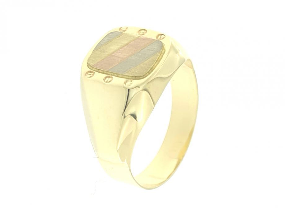 Zlatni prsten, muški, žuto zlato 14K, žig 585, kombinacija glat-mat, pečatnjak, na vrhu kombinacija žuto-bijelo-crveno zlato.