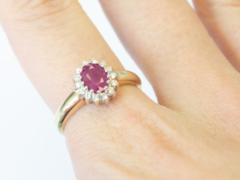 Zlatni prsten sa rubinom i dijamantima, ženski, kombinacija žuto-bijelo zlato 14K, žig 585