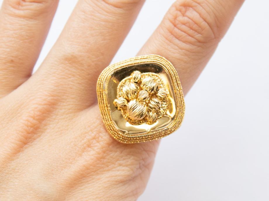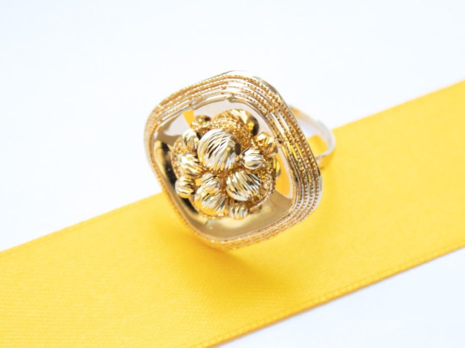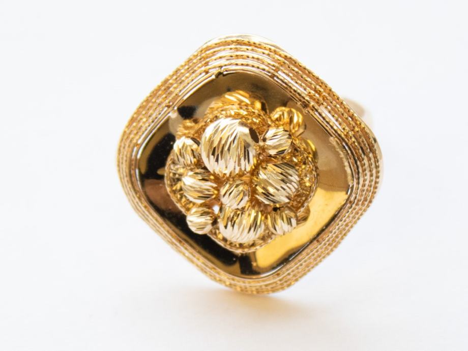Zlatni prsten, ženski, žuto zlato 14K, žig 585, pravokutni "tanjurić" na vrhu - na njemu nareckane kuglice.