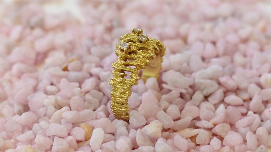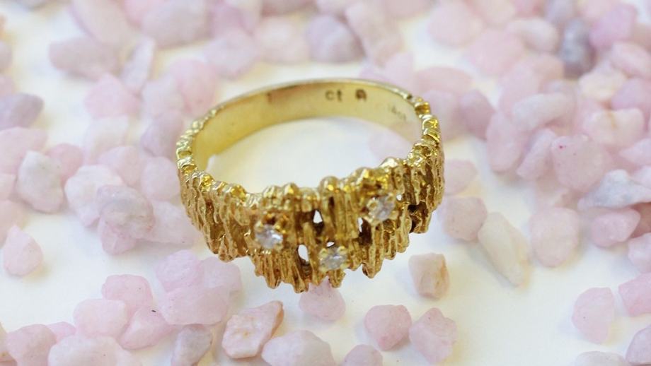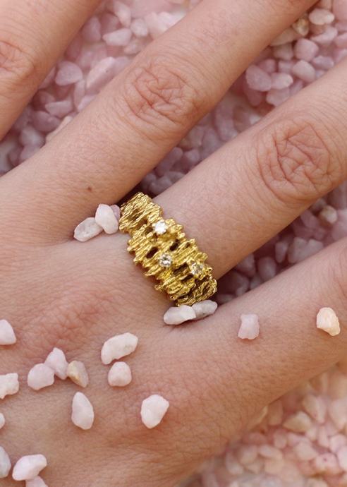 Zlatni prsten s 3 dijamanta, ženski, žuto zlato 18K, štambilj 750, unikatan zanimljivo strukturiran prsten s 3 dijamanta.