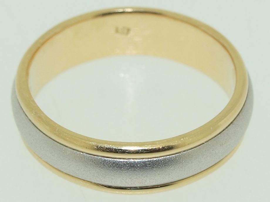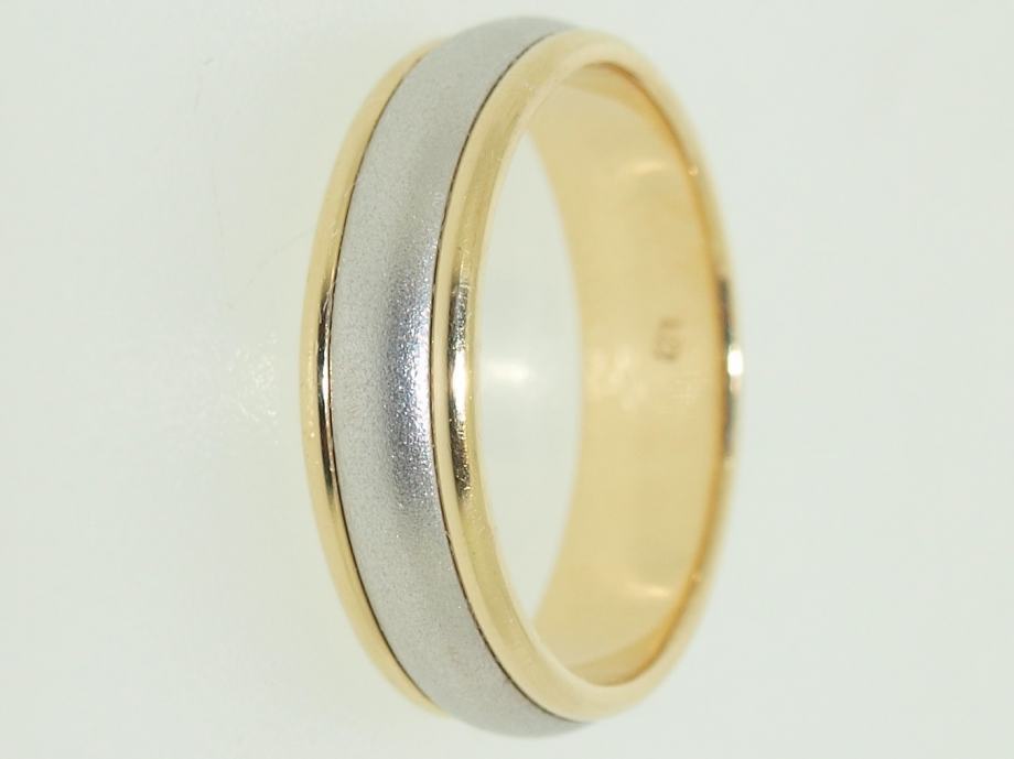 Vjenčani prsten, kombinacija žuto-bijelo 14K zlato, žig 585, flah (ravno) iznutra, izvana bombe (oblo) "navučen" zalotan za žuto, mat bijelo zlato.