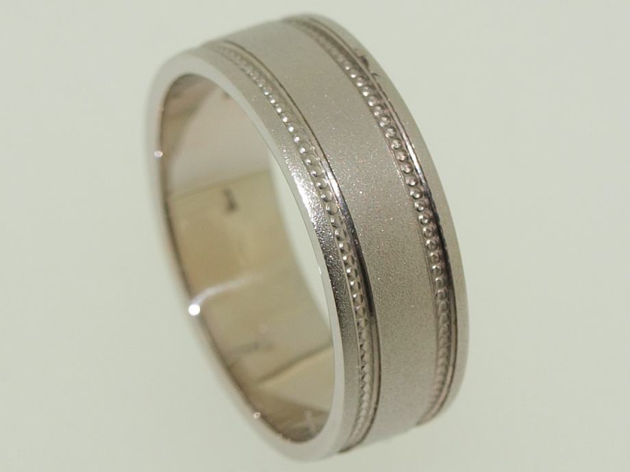 Vjenčani prsten, bijelo 14K zlato, žig 585, flah (ravno) izvana i iznutra, izvana prsten matiran i primjenjena tehnika "miligrif" (sitne točkice u liniju).