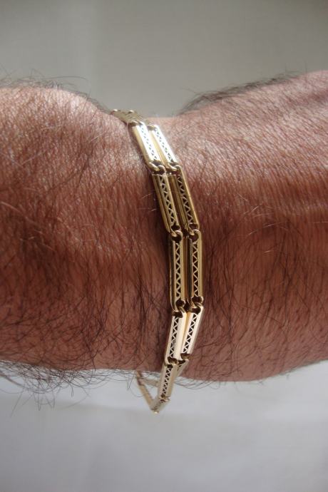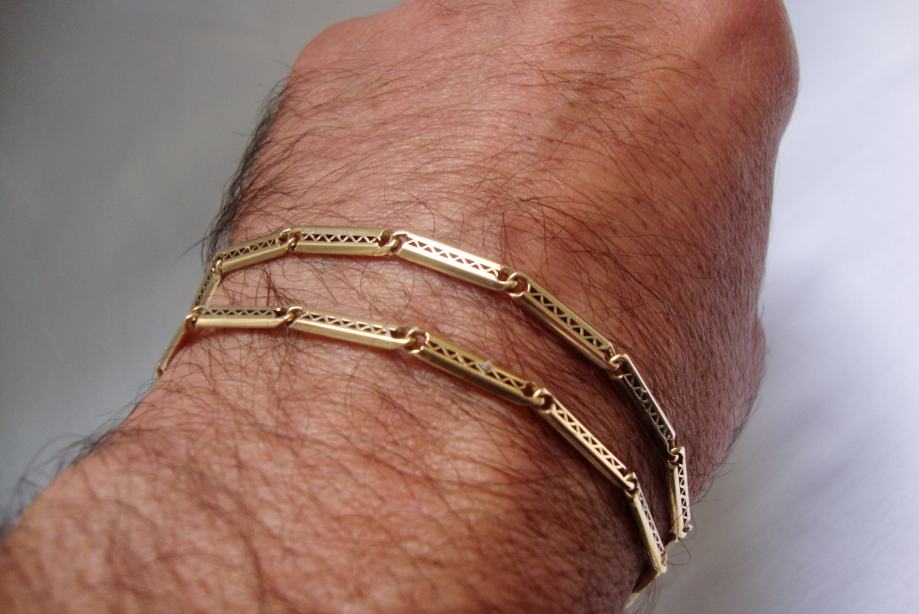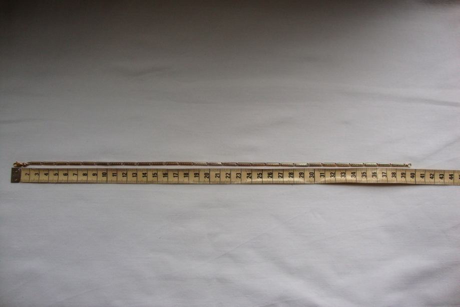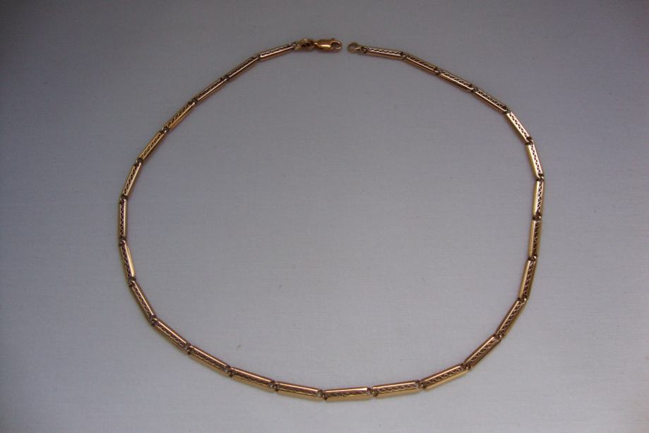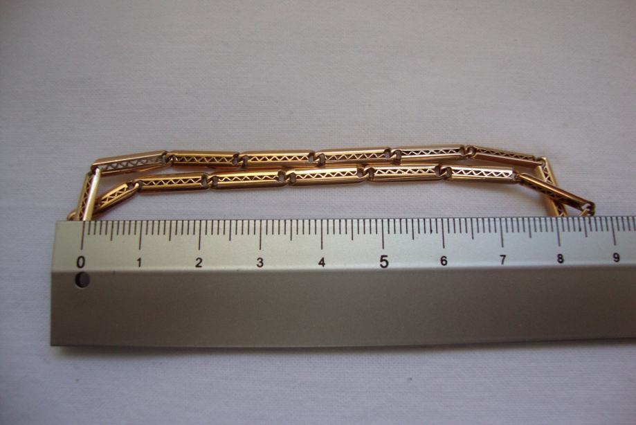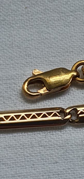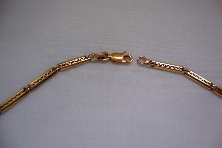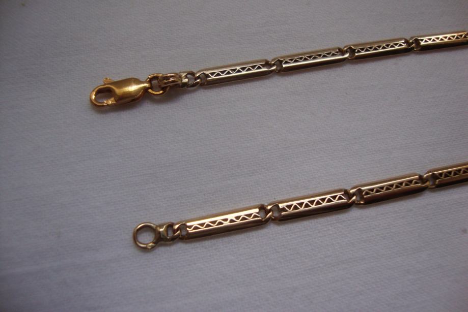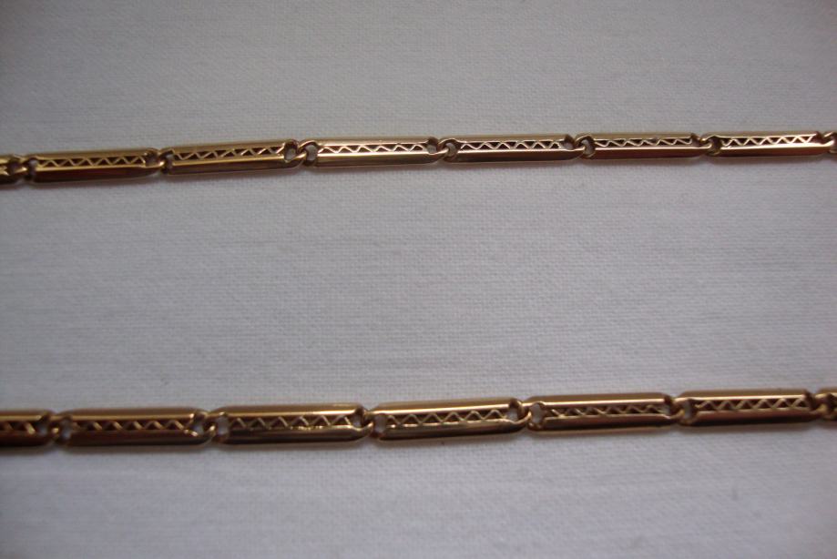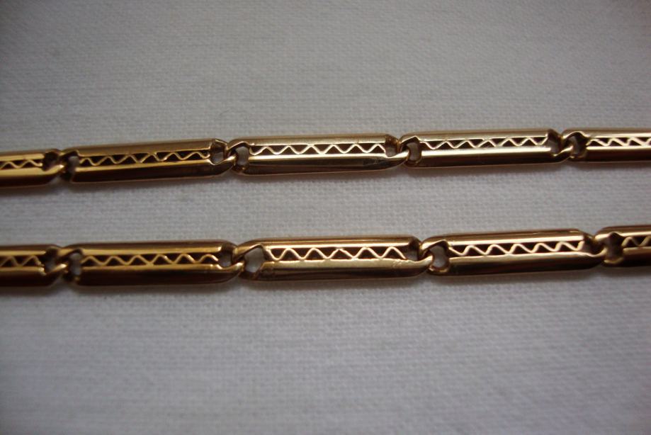 Lanac je ukupne dužine 39.5 cm x 4 mm ima stari slikovni originalni žig na fiksnoj alkici sitan al je od 14 kt dodatno provjereno, mislim da je to nekoć bio lanac za zlatni depni sat te da je zato stavljena kopća od nakita svakako veoma je lijepog uzorka i punih masivnih karika