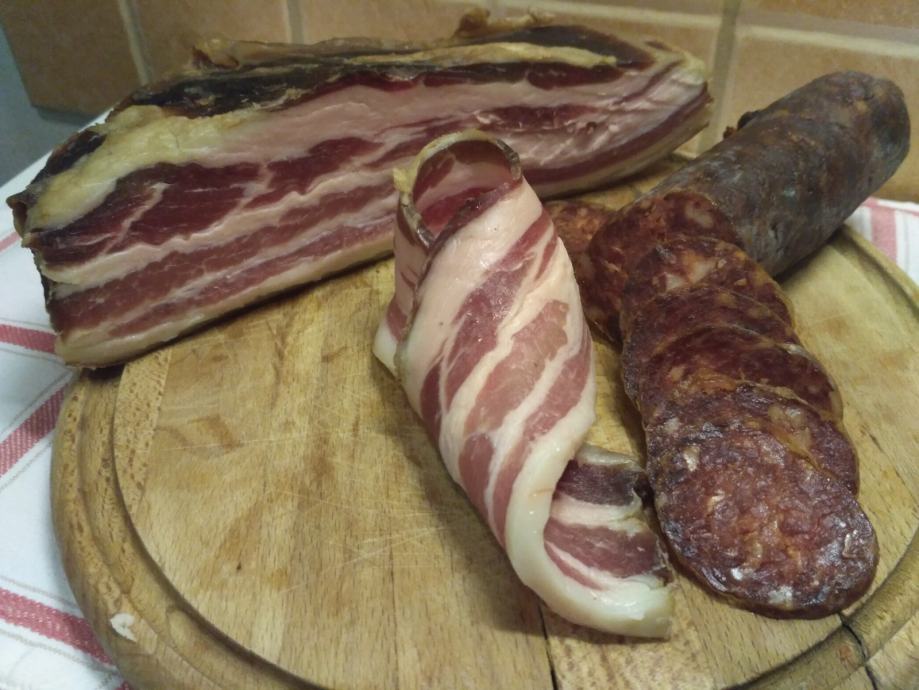 Prodajem domaću slaninu. Slanina je vrlo mesnata (vidljivo na slici oglasa), od bravca 180 kg. Cijena slanine je 60 kn/kg.
