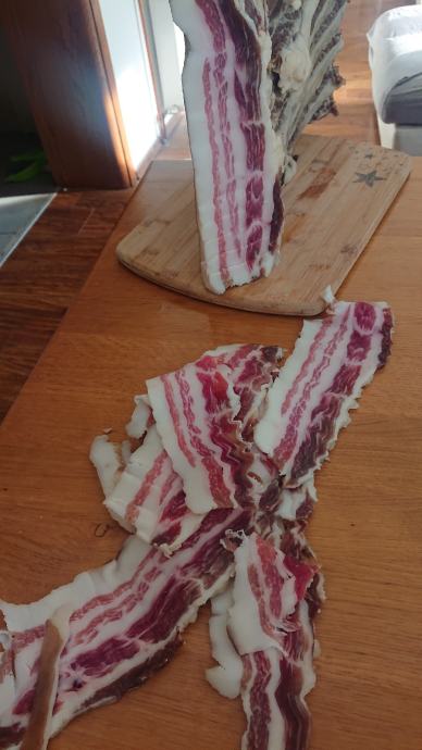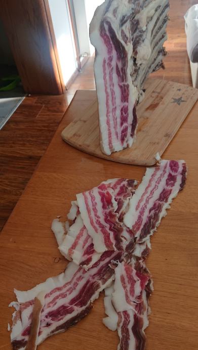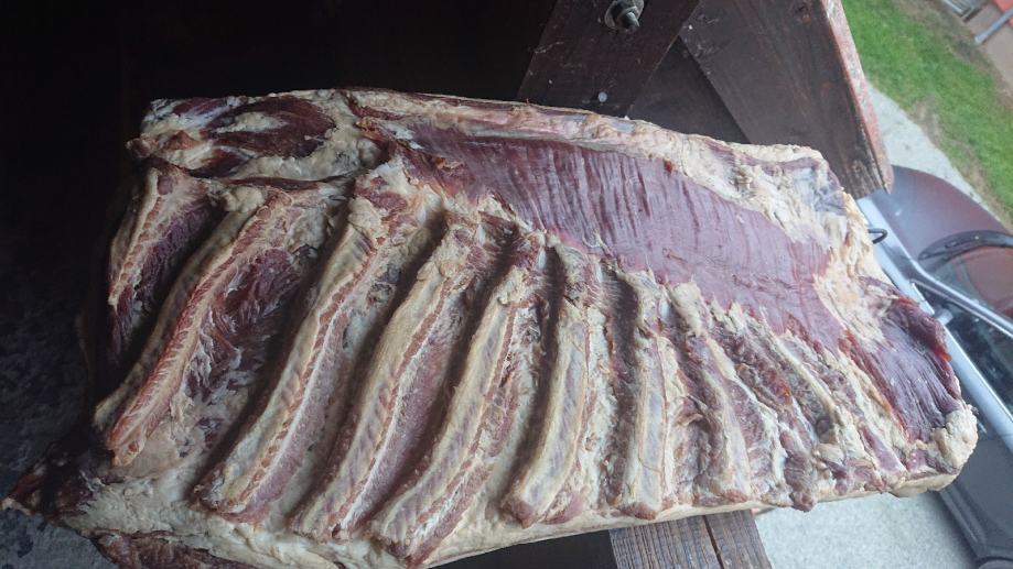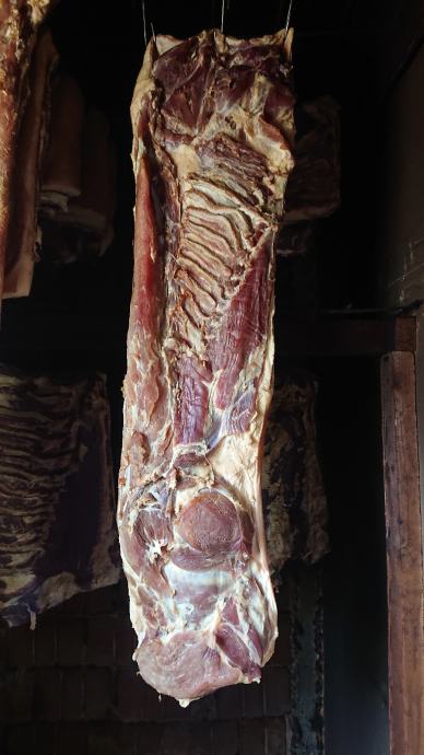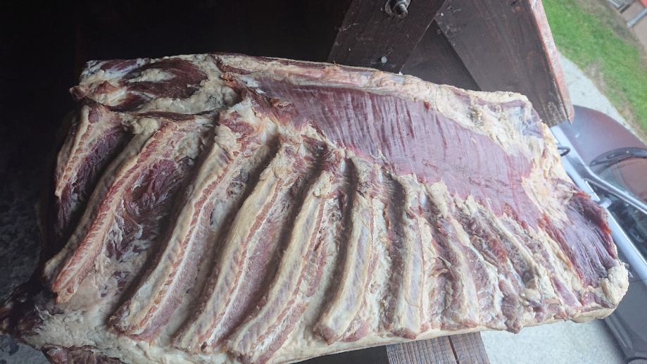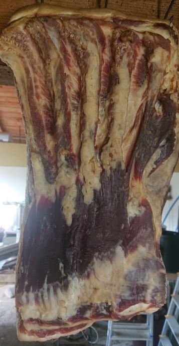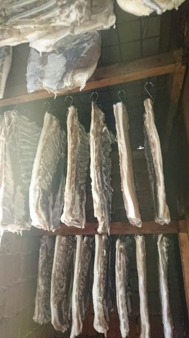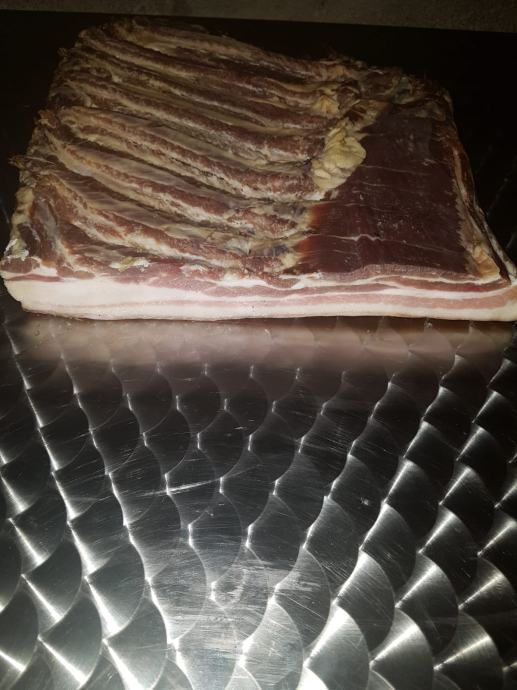 Prodajem odimljenu i prosušenu domacu slaninu. Slanina je od domacih svinja i iznimno je kvalitetna i mesnata. Slanina je obrađena na način da su rebra izvađena specijalnim nožem i kompletno crveno meso je ostalo na tabli slanine (hamburger).