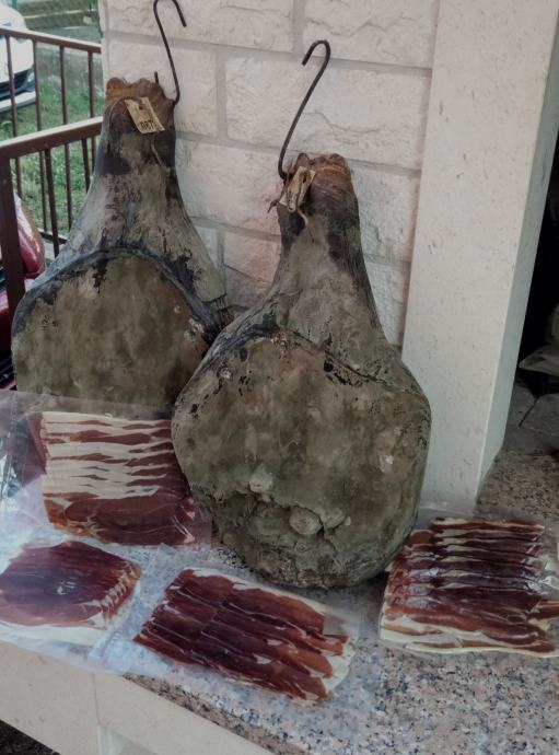 Tradicionalni sušeni dalmatinski pršuti starosti 2 godine, domaći uzgoj svinja, obrada,soljenje i sušenje,težine od 8-15 kg.