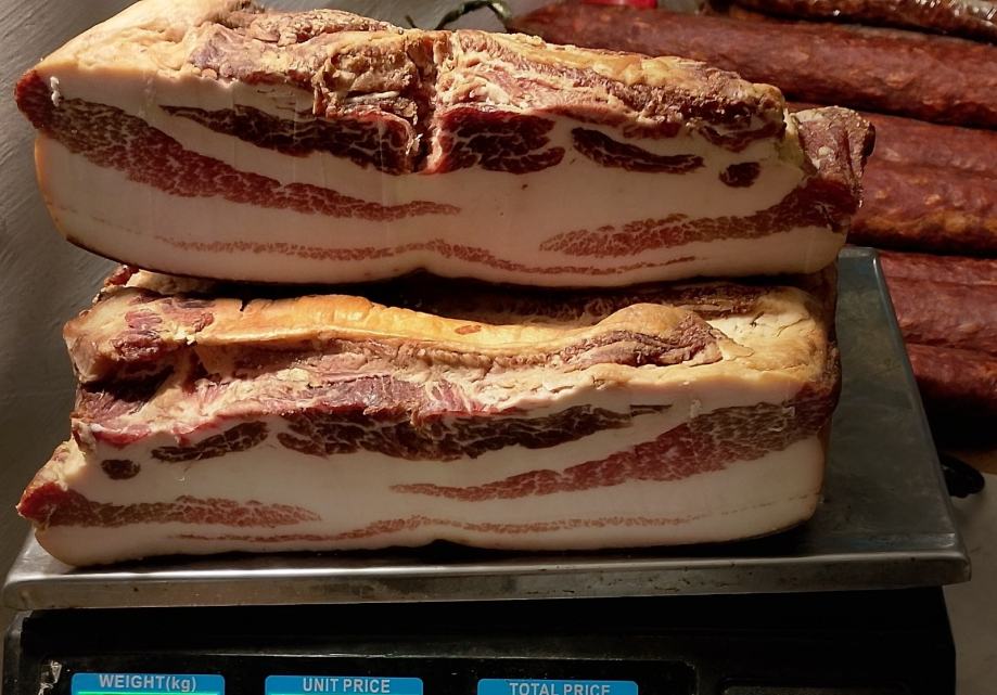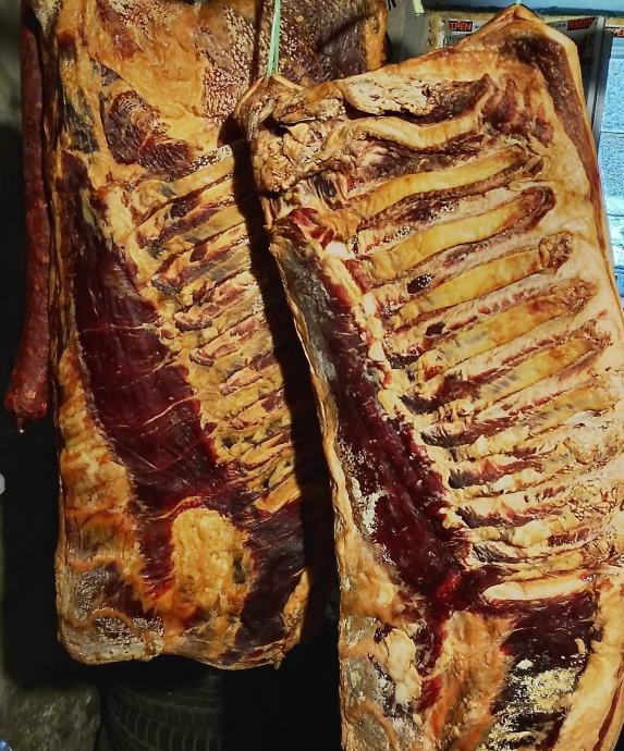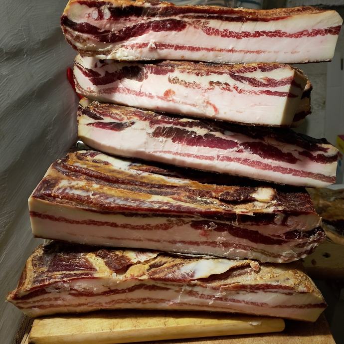 Prodajem suhu domaću slavonsku slaninu 1kg 20 eura. Od svinja iz vlastitog uzgoja bravaca težine 220-300kg.