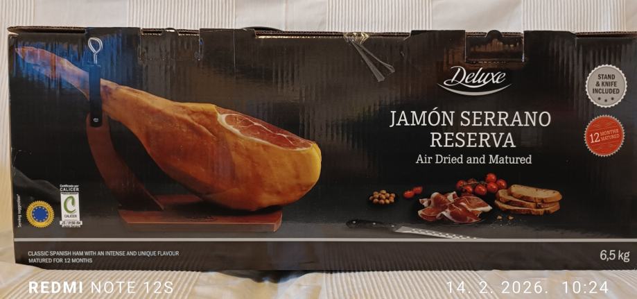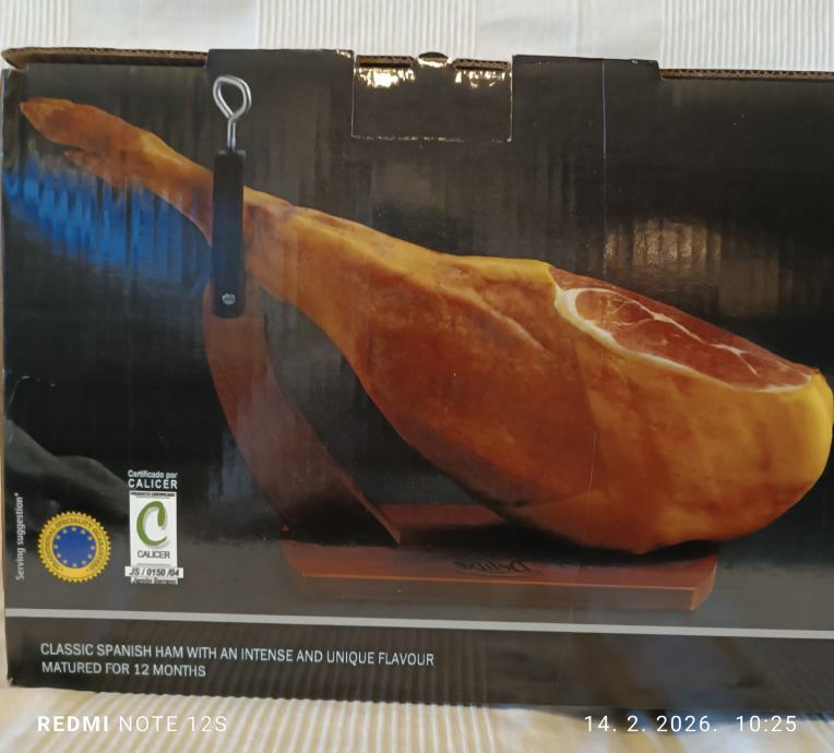 Talijanski pršut, 6,5kg, vakumiran, zapakiran, zajedno sa drvenim postoljem i oštrim nožem za rezanje.