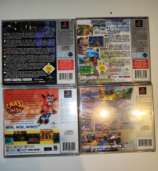 Crash 2, Crash 3, Ctr, Crash bash. Igre kompletne očuvana na engleskom jeziku sa engleskim coverima. Prodajem samo u kompletu. Primopredaja Zaprešić-ZG ili slanje tiskom nakon vidljive uplate