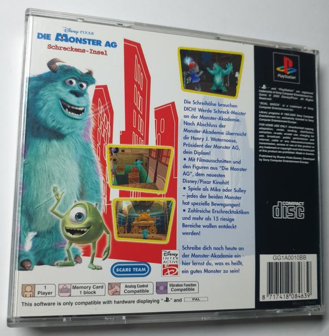 Prodajem rabljenu PlayStation 1 igru Disney Pixar Monsters Inc. ("Die Monster AG") u dobrom stanju s originalnom kutijom. Igra je kompletna s priručnikom i CD-om, savršena za ljubitelje popularne animirane franšize.