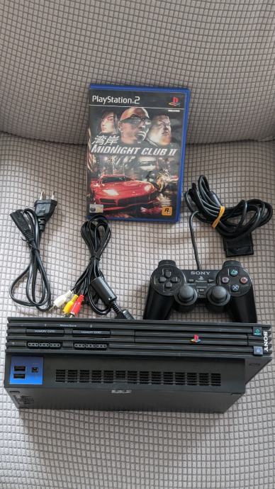 Uz konzolu dolazi av chinch kabel, kabel za napajanje, originalni Sony dualshock 2 kontroler i originalna igra Midnight club 2