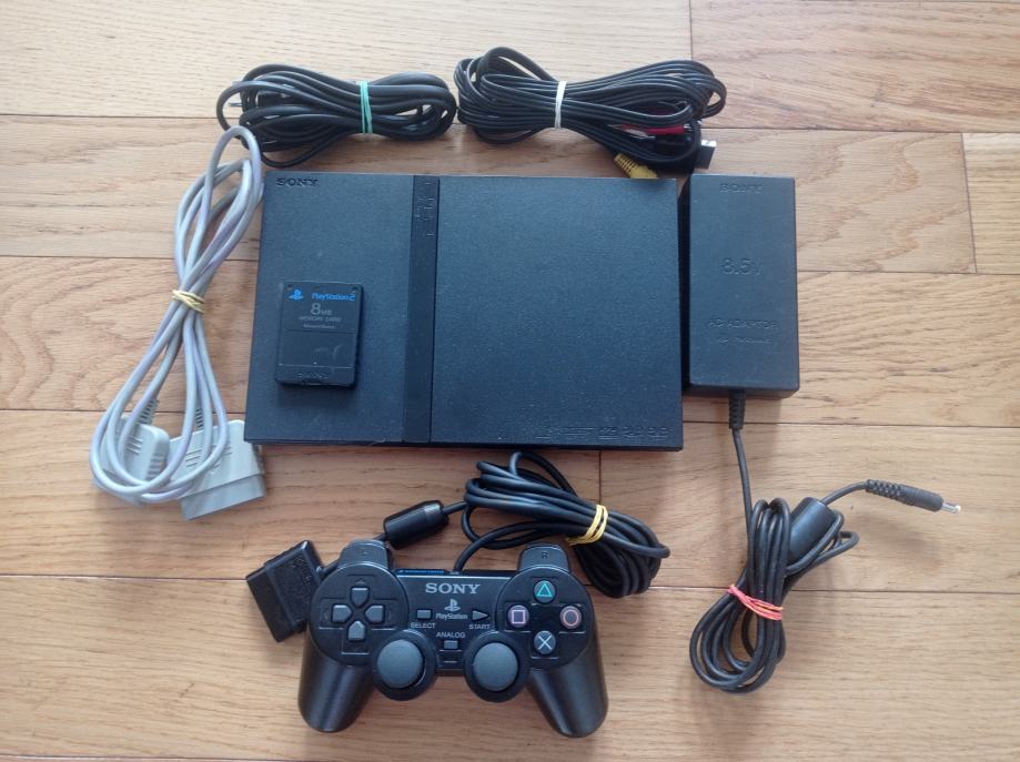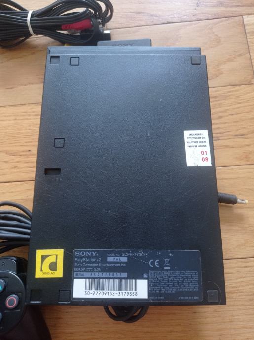 Komplet sve s fotki: pleyka, napajanje, video kabl, memory card, joystick s produžnim kablom i igra.
